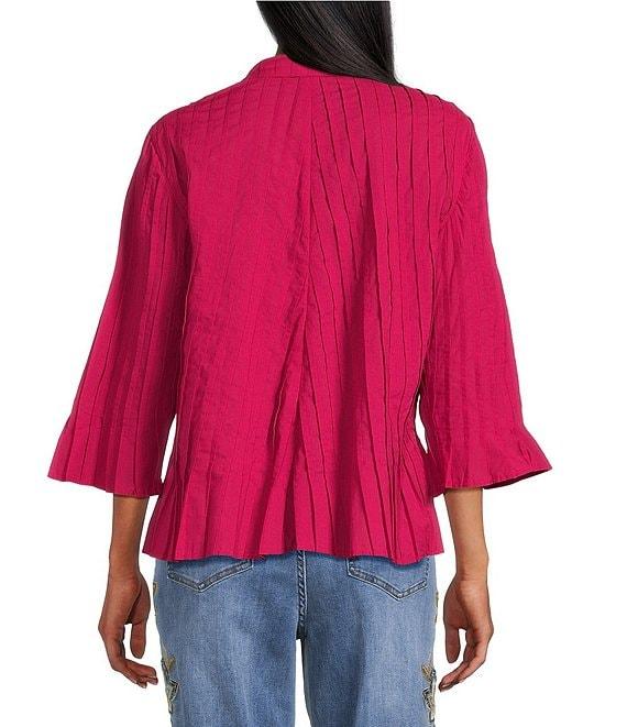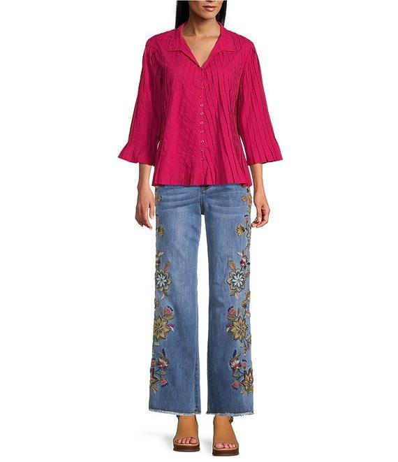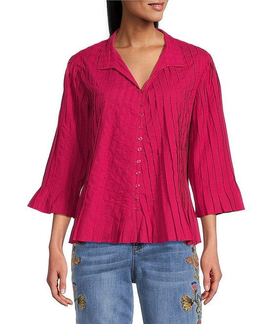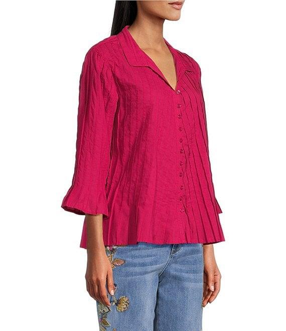 John Mark Pleated Solid Color Wire Collar 3/4 Sleeve Button Front Shirt