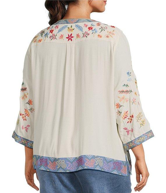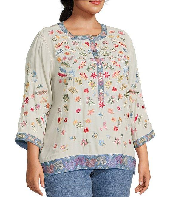 From John Mark Plus, this tunic features: Banded neckline 3/4 cuff sleeves Embroidered motif Loose fit Contrast trim at collar, placket, cuffs and hem Straight hem with side vents Pullover construction with half plackets Approx. 28" length Viscose/rayon; exclusive of decoration Turn inside out/machine wash/line dry Imported.