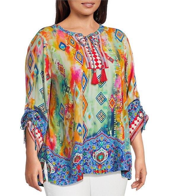 From John Mark Plus, this tunic features: Woven fabrication Slpit v-neckline with tassel ties 3/4 cinched sleeves Multi print Embroidery motif at front placket and cuffs Loose fit Straight hem with side vents Pullover construction Approx. 29" length Viscose/rayon, exclusive of decoration Machine wash cold/tumble dry low Imported.