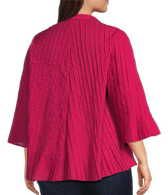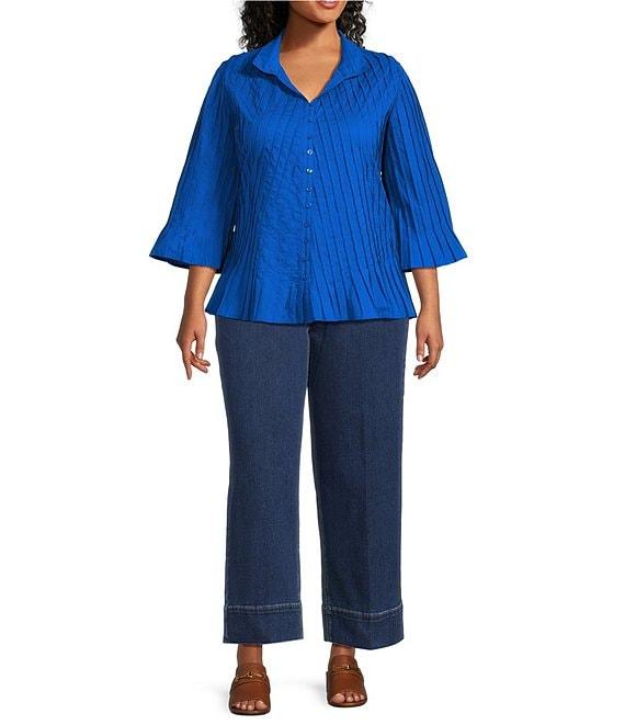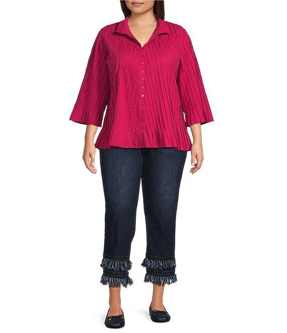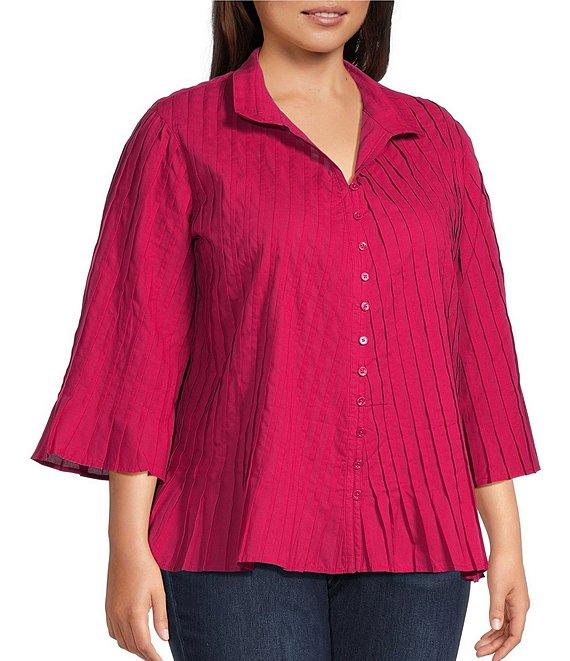 John Mark Plus Size Pleated Solid Wire Collar 3/4 Sleeve Button Front Shirt
