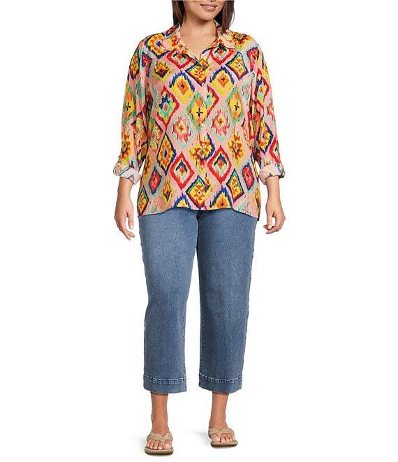 From John Mark Plus, this tunic features: Woven fabrication Tunic silhouette Point collar Long roll-tab sleeves Abstract diamond print Loose fit Straight with curved hem Button front closure Approx. 29" front length; 30" back length Viscose/rayon Machine wash Imported.