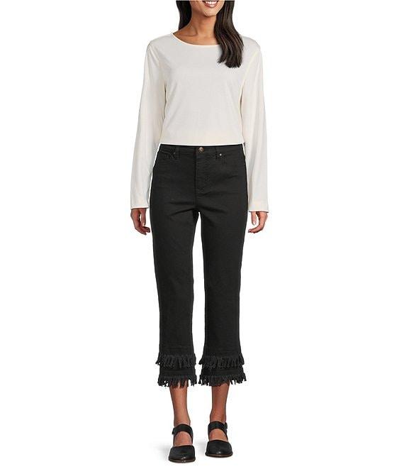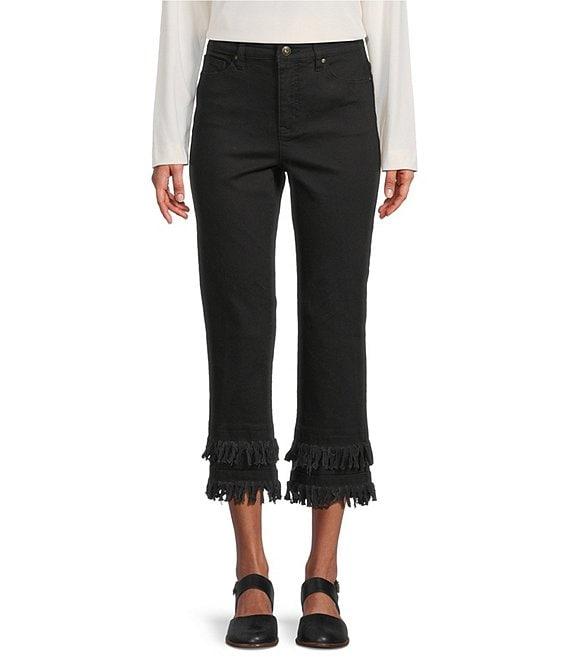 From John Mark, these jeans feature: Stretch denim fabrication High rise Belt loops 5 pockets silhouette Double fringe hem Crop length Approx. 37" inseam Button/Zip closure Cotton/polyester/viscose/spandex Machine wash cold/line dry Imported.