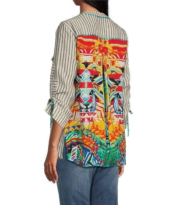 From John Mark, this tunic features: banded collar neckline 3/4 sleeves Chest pockets Stripe/pattern print Embroidered detail Hi-low hem Button front placket/pullover construction Approx. 27.25" front, 28.5" back length Linen/rayon/viscose Machine wash Imported.