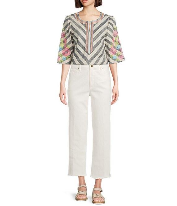 From John Mark, this tunic features: Woven fabrication Split round neckline 3/4 bubble sleeves Stripe pattern Embroidered floral at sleeves Loose fit Pullover construction Approx. 25" center front length; 25.5" center back length Self: linen/rayon; lining: cotton; exclusive of decoration Turn inside out/machine wash cold/line dry Imported.
