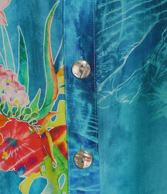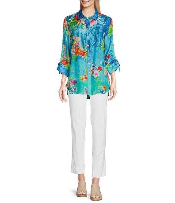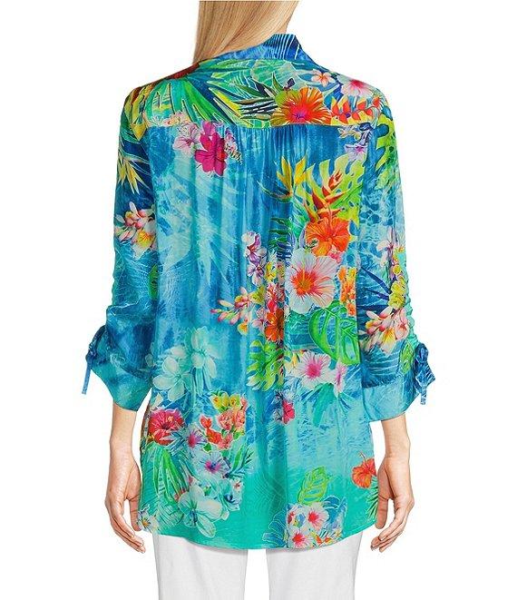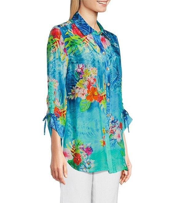 From John Mark , this tunic features:Woven fabricationPoint collar necklineElbow-length sleeves with cinch ties Tropical floral print Loose fit Straight with curved ends and side vents Button-front closureApprox. 31" front length; 32" back length Viscose/rayon Machine wash/tumble dryImported.