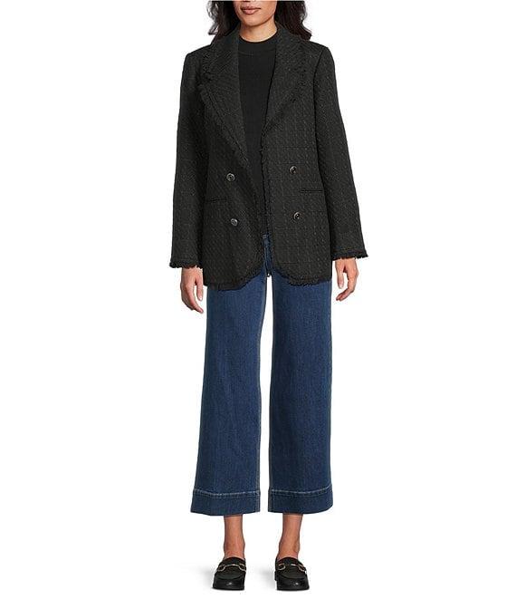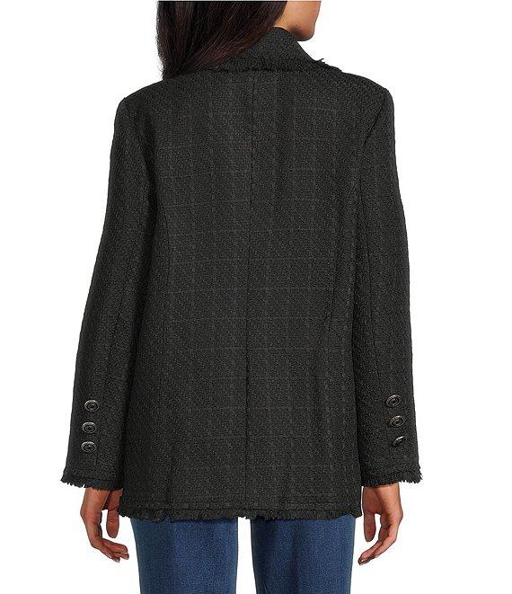 From John Mark, this coat features: Tweed fabrication Open lapel Long sleeves Fringe at lapel, hems and sleeves Two front functional welt pockets Button front Approx. 28.5" center front: 30" length center back Polyester/cotton/rayon/acrylic Machine wash/tumble dry Imported.