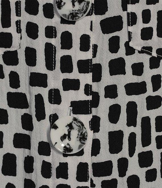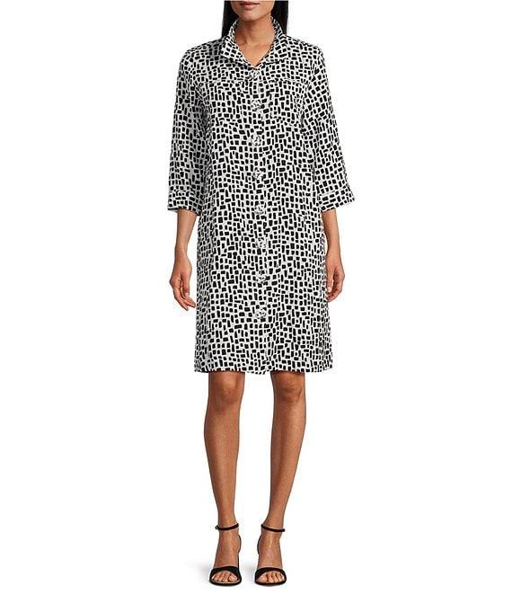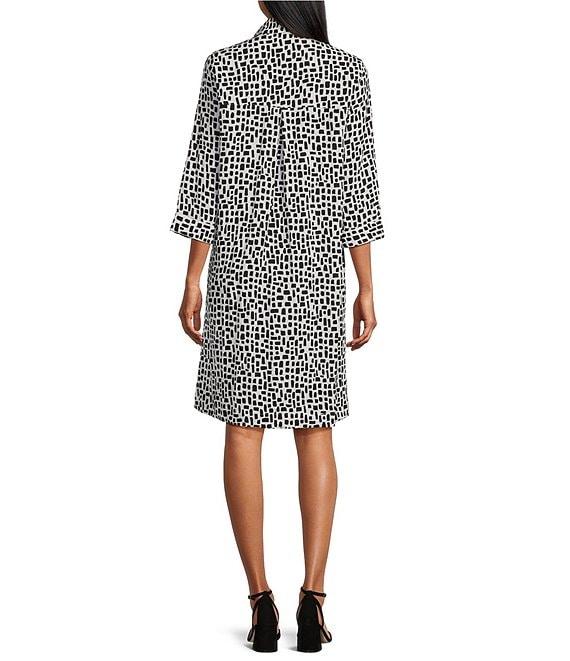 From John Mark, this dress features: Woven fabrication Black white with square print over Wire collar 3/4 sleeves with cuffs Front button down closure Side pockets and two chest pockets Loose fit Straight hem Approx. 40.34" length Rayon/nylon Machine wash cold/tumble dry low Imported.