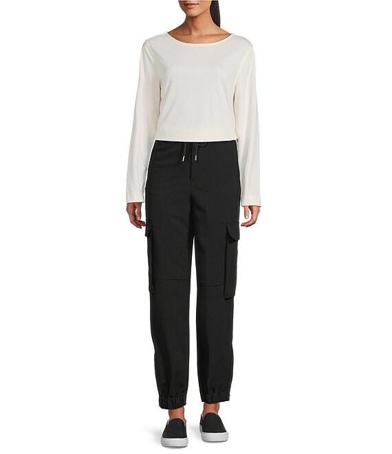 From John Mark, these jogger pants feature: Woven fabrication Drawstring waistband Cargo pockets Faux welt back pockets Loose fit Zip/button front closure Approx. 26.25" inseam Shell: polyester/rayon/spandex, pocket lining: polyester Machine wash Imported.