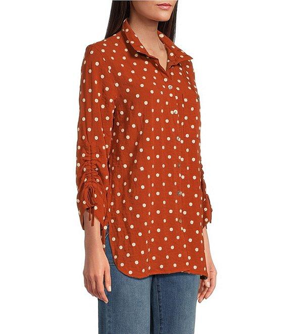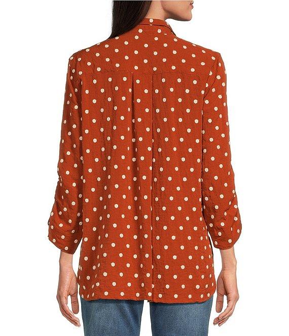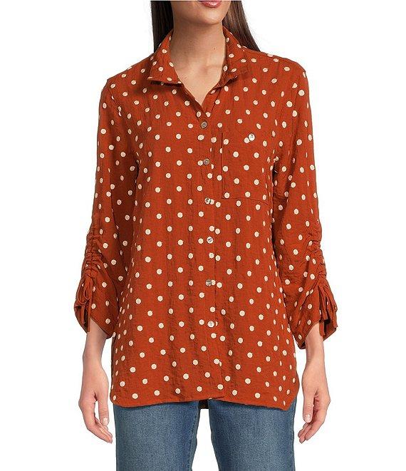 From John Mark, this top features:Woven fabricationEmbroidered dot detailPoint collar neckline3/4 sleevesCinch tie sleevesFront functional chest pocketButton front closureApprox. 29" lengthRayon/nylonMachine wash/tumble dryImported.