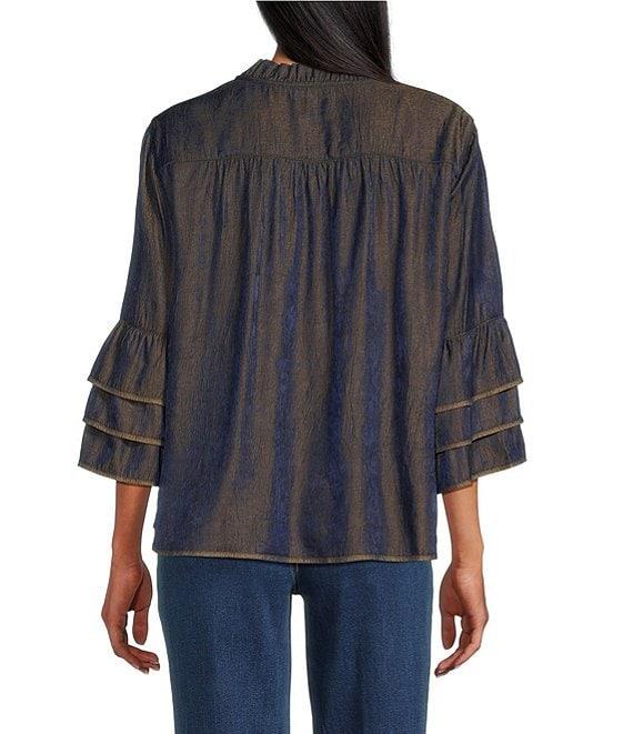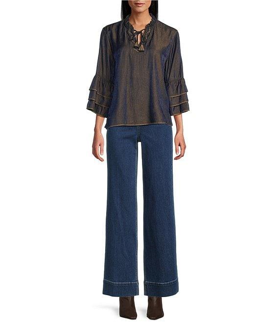 From John Mark Petite, this tunic features: Woven fabrication Ruffle split v-neckline with tassel ties 3/4 tiered sleeves Loose fit Metallic embroidery pattern on neckline Hi-low hem with side vents Pullover construction Approx. 23.25" center front; 23.75" back length Polyester/rayon; exclusive of decoration Machine wash/tumble dry Imported.