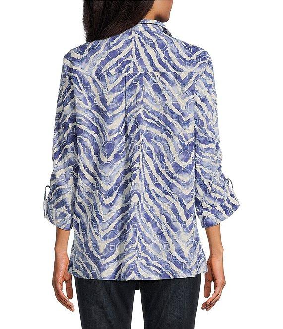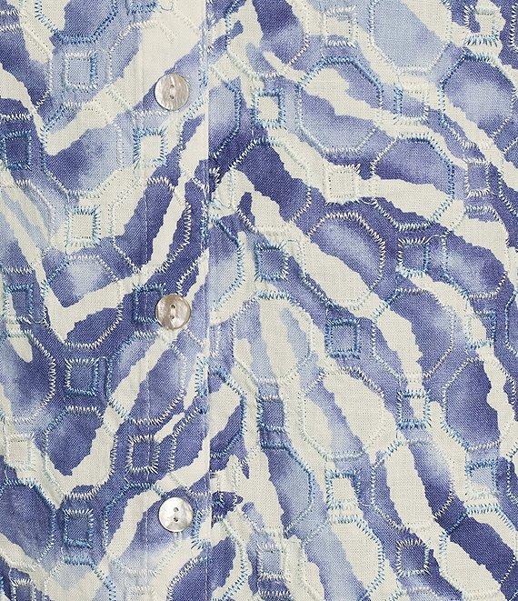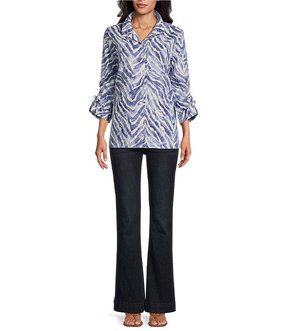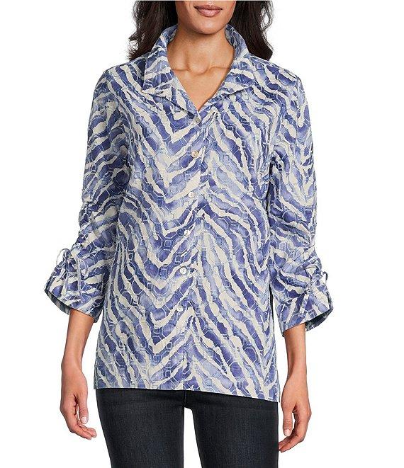 From John Mark, this tunic features: Wire collar neckline 3/4 sleeves with cinch ties Geometrical embroidery Zebra print Slight hi-low hemline Button-front closure Approx. 28.75" center-front length; 29.25" center-back length Linen/cotton; embroidery: cotton Machine wash cold on gentle/tumble dry low; low iron if needed Imported.