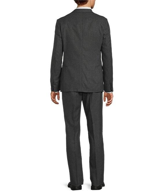 From John Varvatos, this 2-piece suit features: Jacket: Pattern Notch collar Long sleeves Flap pockets Side vents Partially lined 2-button front closure Wool/cotton Dry clean Pants: Pattern Flat front 4 pockets Button/zip front closure Wool/cotton Dry clean Imported.