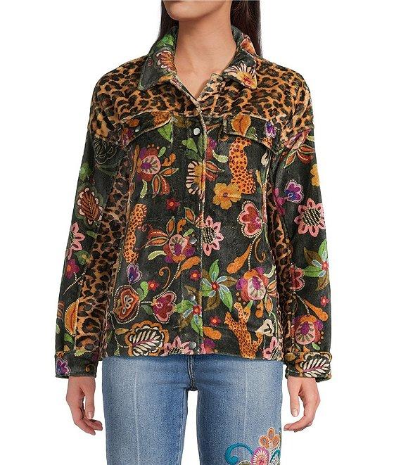 From JOHNNY WAS, this jacket features: Sherpa knit fabrication Floral and animal print Point collar neckline Long sleeves Front pockets Straight hem Snap front closure Approx. 29.5" length Polyester Dry clean Imported.