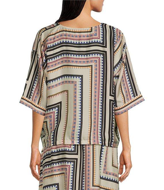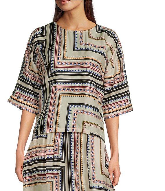 JOHNNY WAS Arden Geometric Printed Silk-Blend Round Neck Short Sleeve Coordinating Blouse