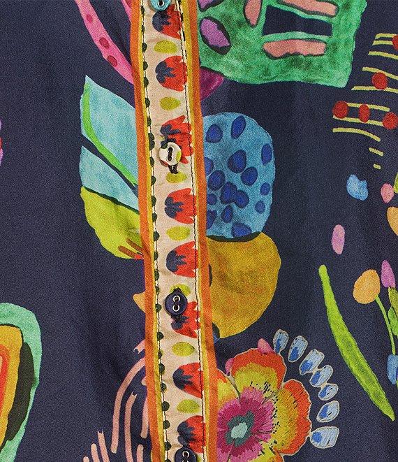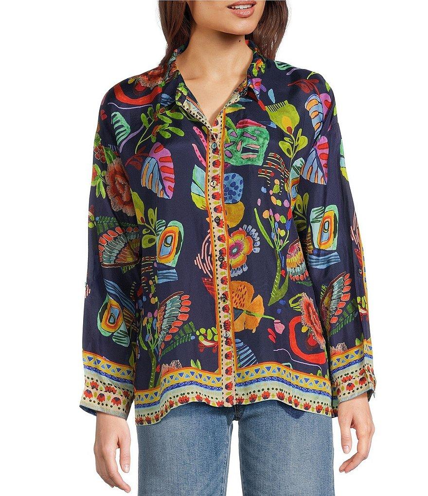 From JOHNNY WAS, this blouse features: Luxurious silk fabrication V-neckline Long sleeves Farout boho floral print Back shirring detail Relaxed fit Straight hemline Button front closure Approx. 26.5" length Silk Dry clean Imported.