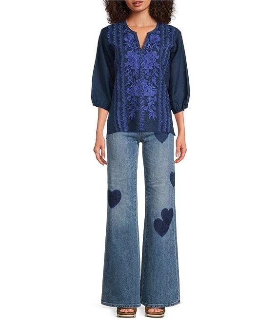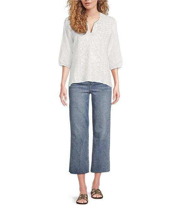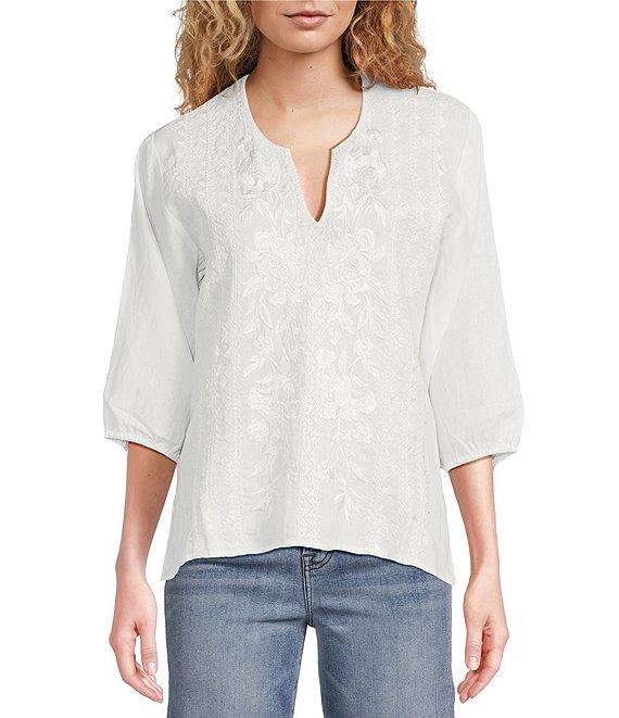 JOHNNY WAS Camille Embriordered Linen Split V-Neck 3/4 Puff Sleeve Blouse