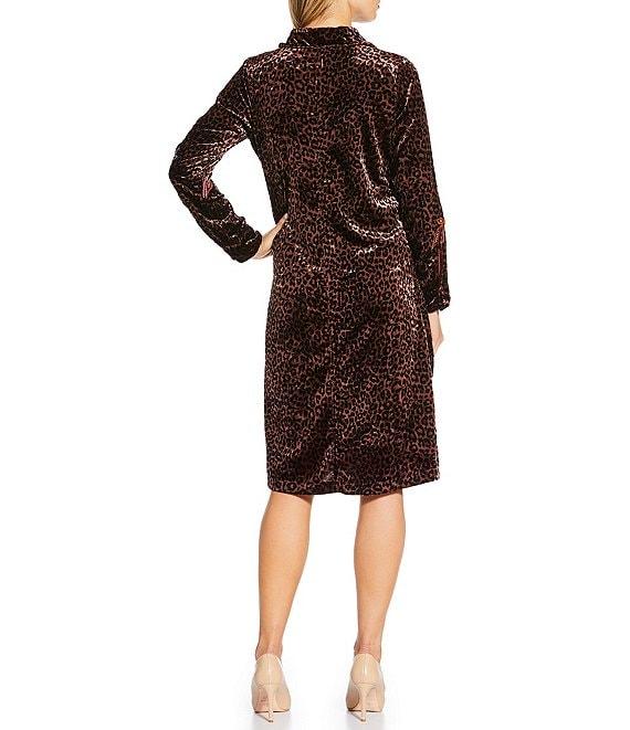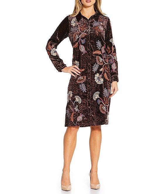 From JOHNNY WAS, this dress features: Luxurious leopard print velvet fabrication Embroidered floral details Shirt dress silhouette Point collar Long sleeves Straight hem Button-front closure Approx. 42" length Viscose/nylon Dry clean Imported.