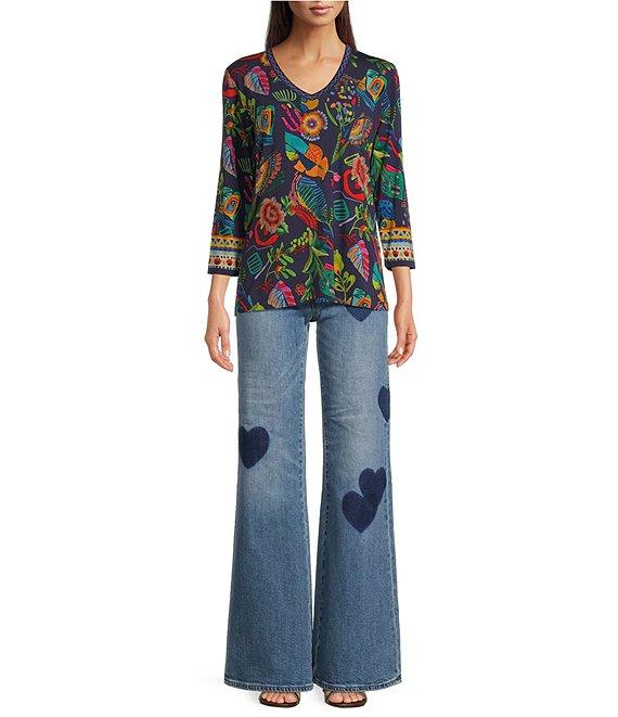 JOHNNY WAS Janie Favorite Farout Floral Scarf Print Bamboo Knit V-Neck 3/4 Sleeve Tee