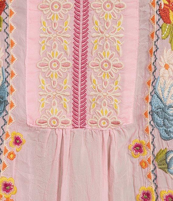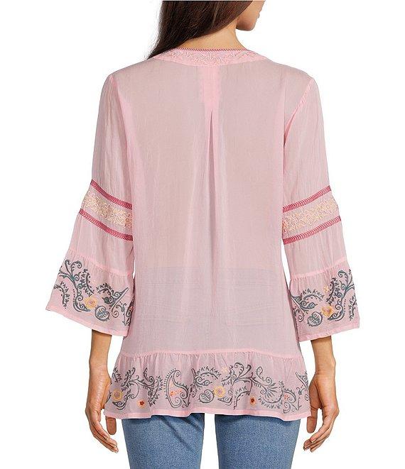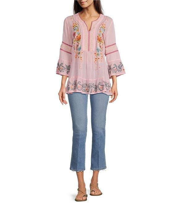 JOHNNY WAS Jojo Embroidered Woven Split V-Neck 3/4 Bell Sleeve Tunic