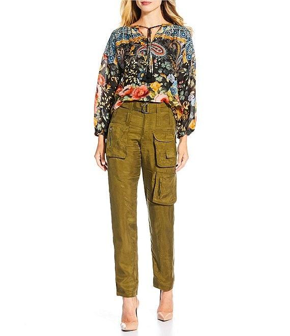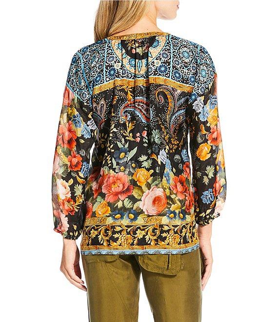 From JOHNNY WAS, this blouse features: Luxurious silk woven fabrication Ornate floral print Split V-neckline with tassel ties Drop shoulders Bishop bracelet length sleeves Straight hem Pullover construction Approx. 27" length Silk Hand wash Imported.
