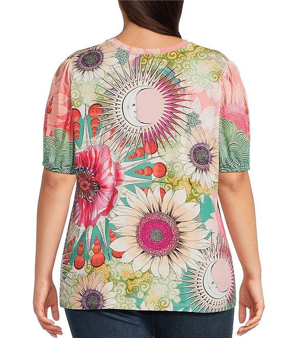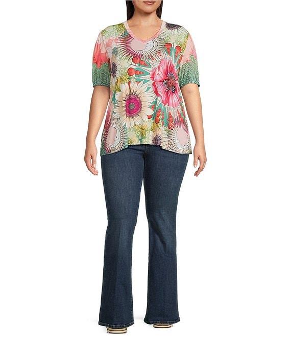 JOHNNY WAS Plus Size The Janie Favorite Emily Abstract Floral Print V-Neck Short Puff Sleeve Knit Tee