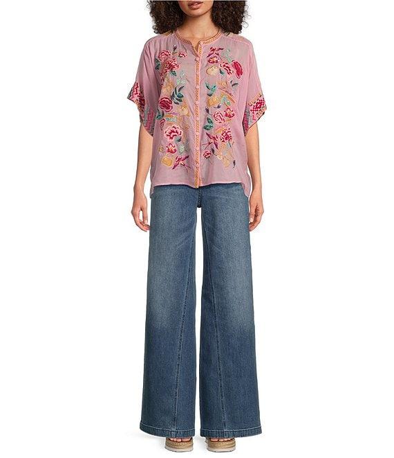 From JOHNNY WAS, this blouse features: Curpo silky woven fabrication Mandarin collar 3/4 kimono sleeves with embroidered hem Boxy fit Embroidered placement floral Straight hem Button front closure Approx. 25.5" length Cupro Machine wash/tumble dry Imported.