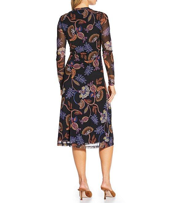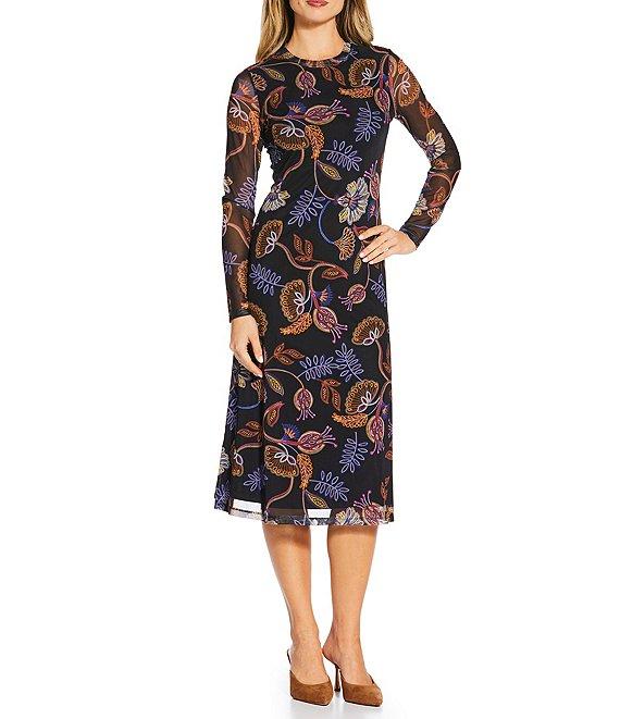 JOHNNY WAS Shelly Floral Printed Mesh Crew Neck Long Sleeve Asymmetrical Midi Dress
