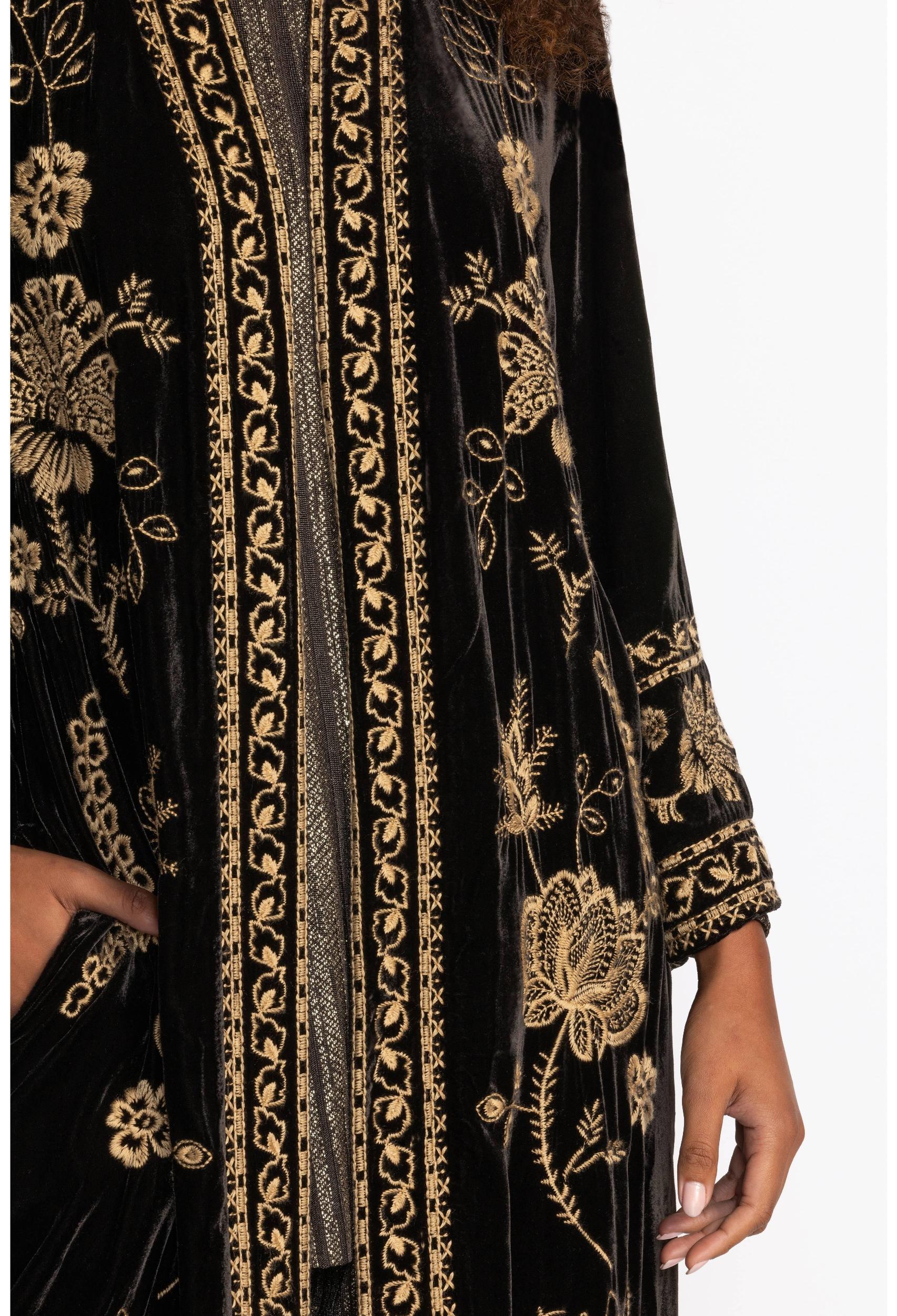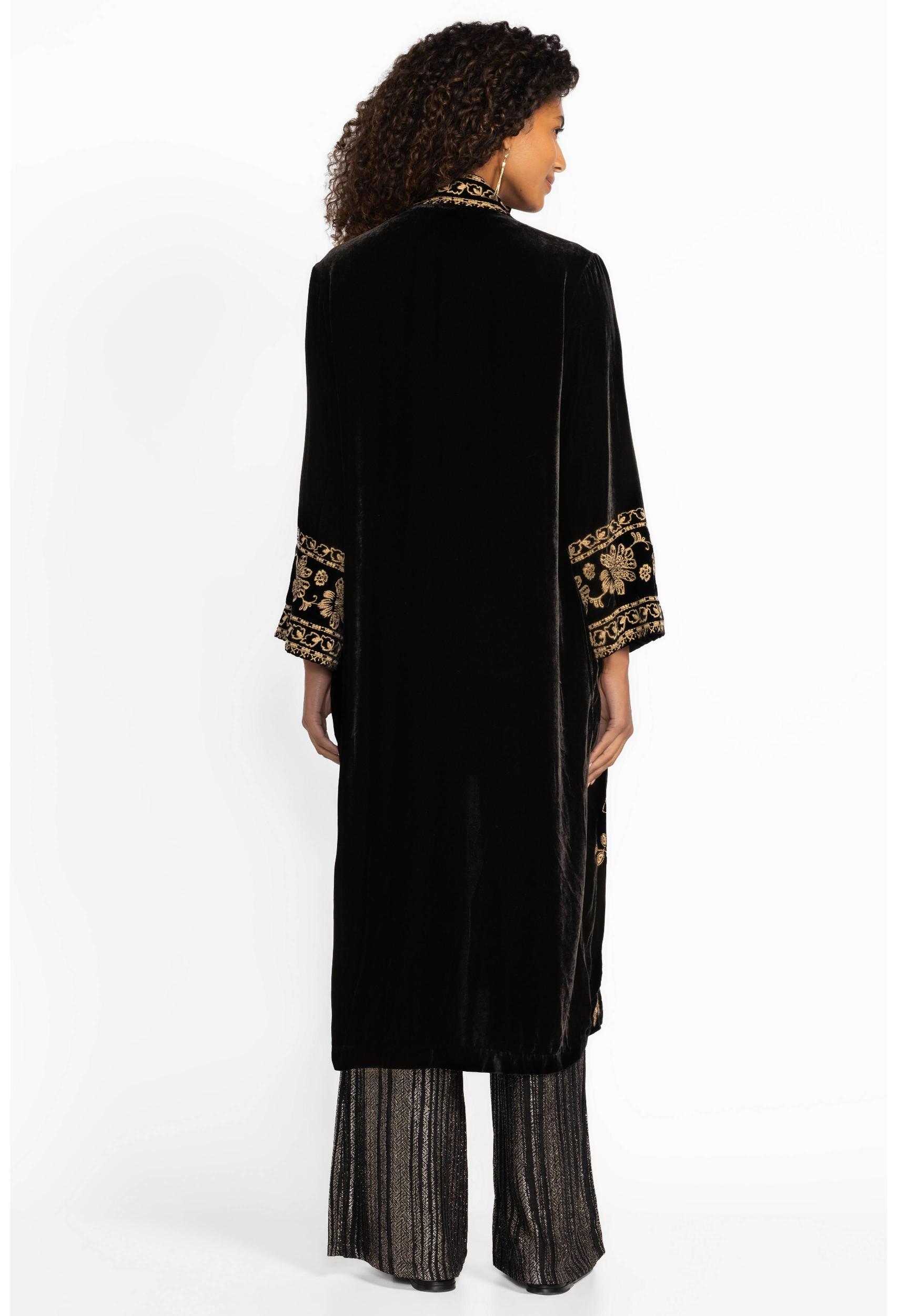 Enhanced with intricate embroidered detailing, the Velvet Kimono Coat adds a hint of drama to your style. Crafted from a rich silk blend, this flowing kimono features 3/4 sleeves and an open front bordered with delicate embroidery. Layer over a sleek, monochromatic look and pair with wedge heels for an elegant night out.