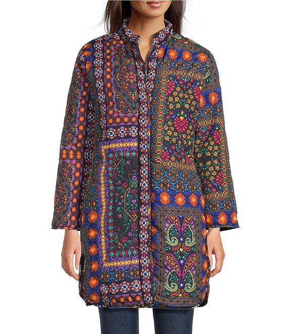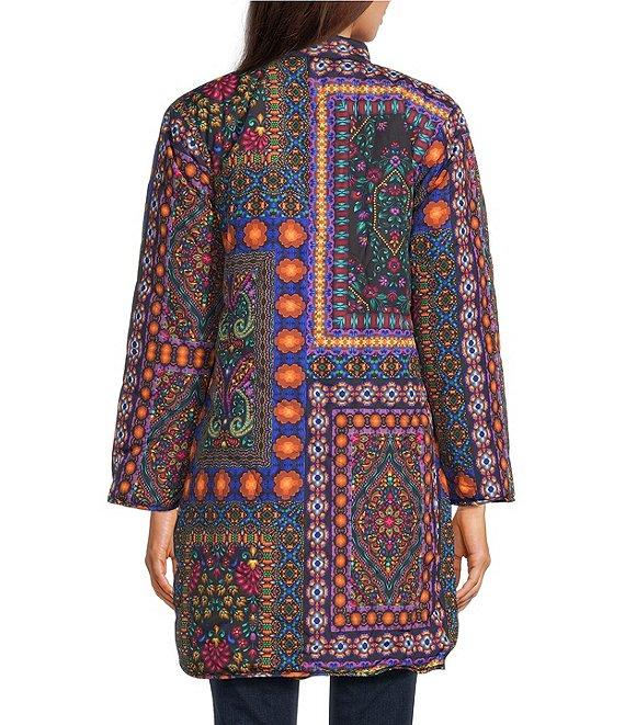 From JOHNNY WAS, this jacket features: Printed woven fabrication Ornate pattern print Banded collar Long sleeves Side pockets Straight hem Open-front; no closure Approx. 35" length Polyester Dry clean Imported.