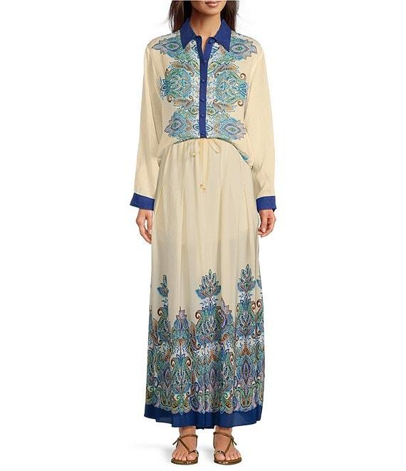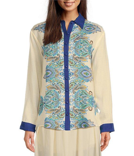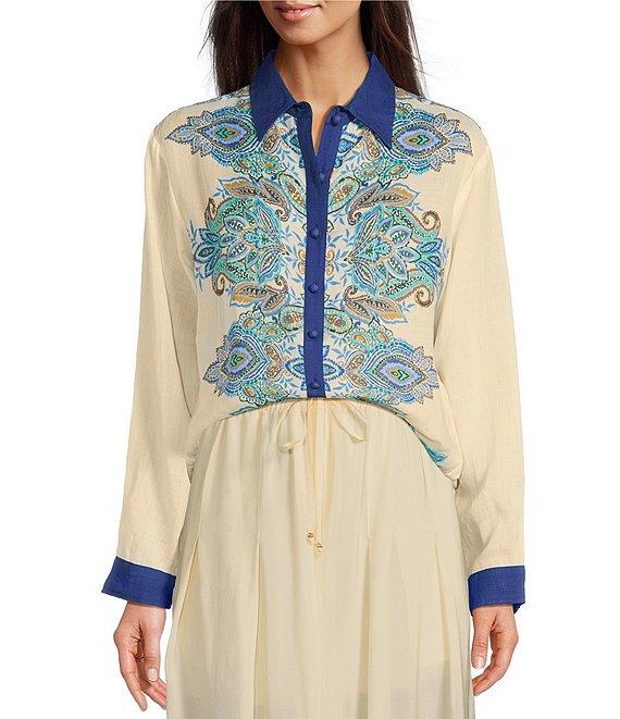 From JOHNNY WAS, this blouse features: Woven fabricationPoint collarLong sleeves Contrast trim detail Shirttail hemlineButton-front closure Approx. 27" length RamieDry clean only Imported.