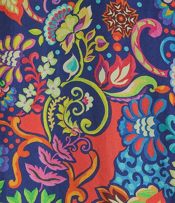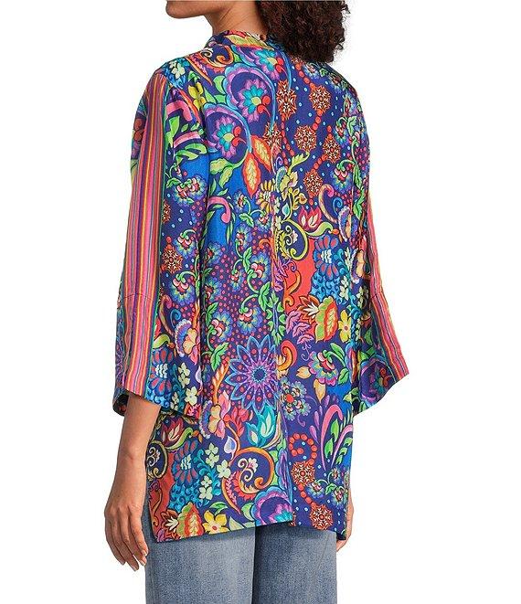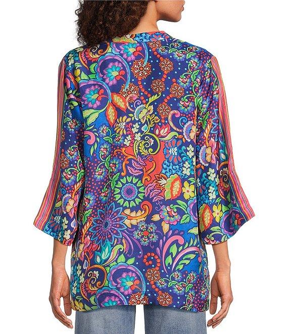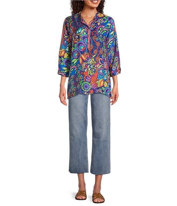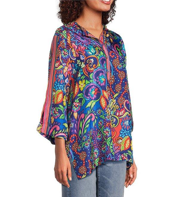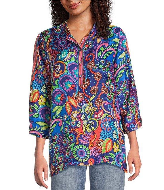 From JOHNNY WAS, this tunic features: Mod floral print silk woven fabrication Tunic silhouette Banded collar neckline 3/4 sleeves with slit hem Straight hemline with side slits Five-button half-placket closure Approx. 28" length Silk Hand wash/ lay flat to dry Imported.