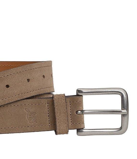 From Johnston & Murphy Collection, the Men's English Suede Baldwin Belt: Crafted of English suede Brushed nickel buckle Top-stitched edge Leather lined Approx. 1.375" width Made in USA. Suggested belt size: Take your existing pants size and add two inches. E.g. if your pants size is 32, purchase a size 34.