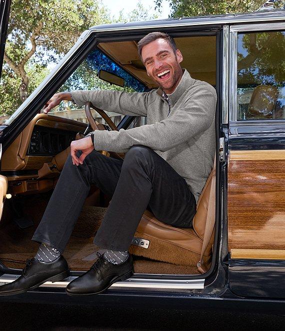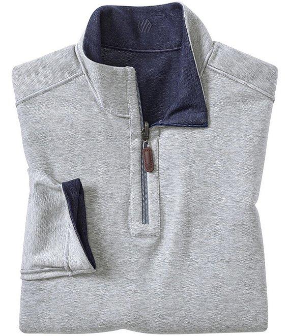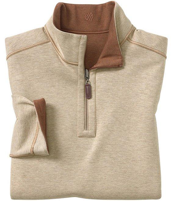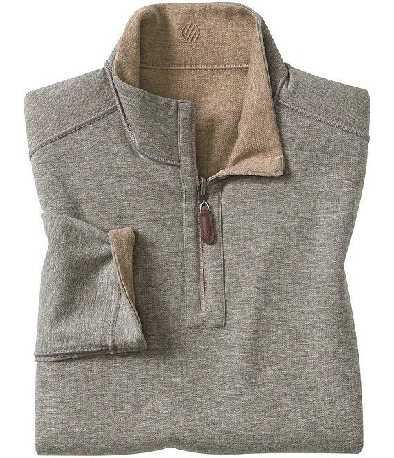 From Johnston & Murphy, this pullover features: Mock neck Long sleeves Quarter-zip placket with logo leather-look pull Logo embroidery on the back neck Pullover construction Tonal cover-stitch details Soft cotton-blend heather knit reverses to a different color for multiple wear options Cotton/polyester/rayon Machine wash/tumble dry Imported.