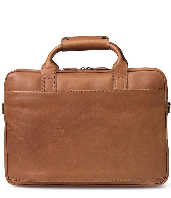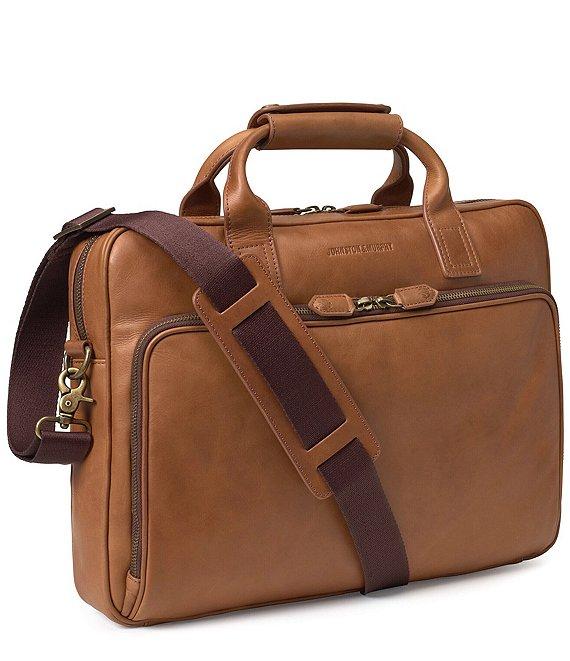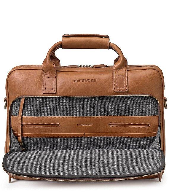 From Johnston & Murphy, the Men's Rhodes Leather Briefcase features:Smooth, full-grain steer leatherCotton twill lining in signature J&M custom plaidTop main compartment includes highly padded laptop section for up to 15" laptop, large open pocket full length zip pocketInterior zip pocket for personal accessoriesLarge front-zip pocket with organization panel with four pockets,one card pocket, three pen loops, and a key leashBack pocket with magnetic closure and bottom zipper sleeve for sliding over rolling luggage handleAdjustable/detachable web shoulder strap with leather shoulder padTop leather carry handleAntique brass hardware16 "L x 11" W x 2" DImported