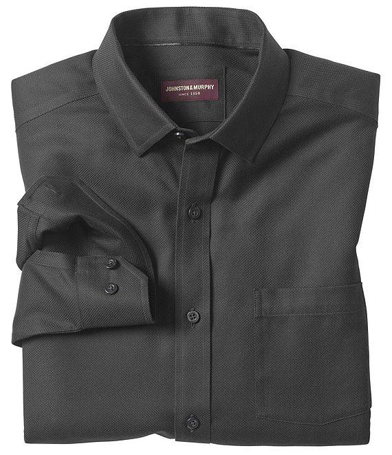 From Johnston & Murphy, this shirt features: Solid tone Hidden button-down collar Long sleeves with two-button cuffs Contrast facing at interior collar and cuffs Patch pocket on the left side of chest Shirttail hem Non-iron Yarn-dyed dobby weave Cotton Machine wash/tumble dry Imported.