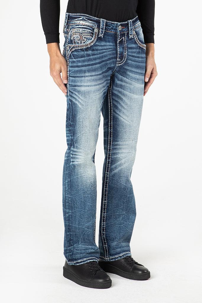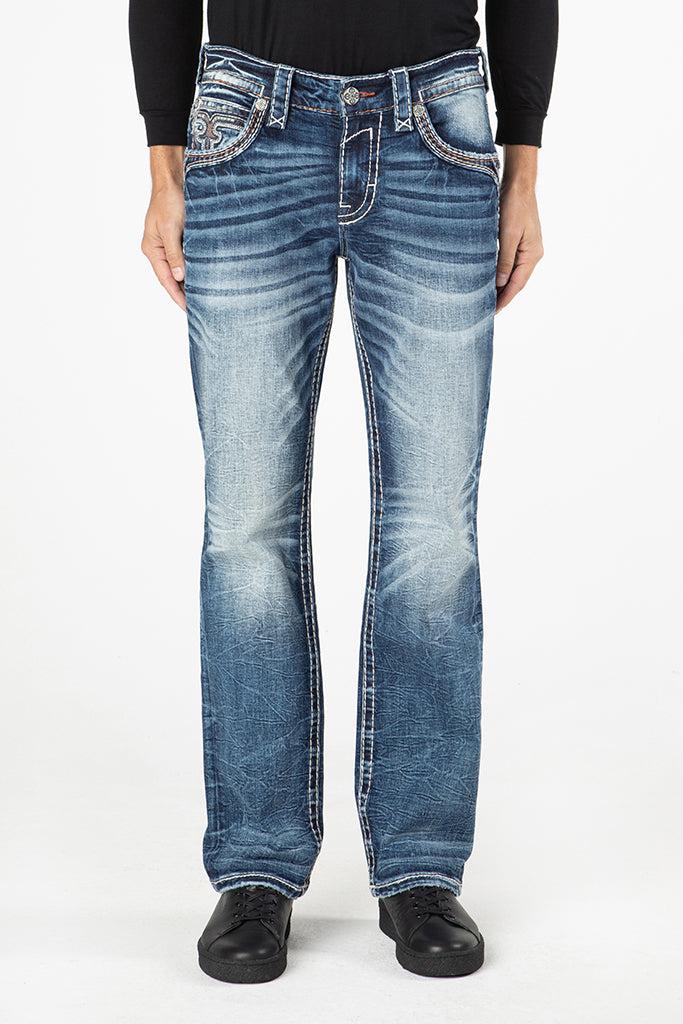 Pewter off-white brushed buttons and rivets throughout Featuring the iconic inverted Fleur de Lis design on pockets, embellished with brown and white stitching. "Rock Revival" metal engraved with double "RЯ" emblem on a beige and brown snake leather patch on the waistband. Designed with care and creativity in Los Angeles, California.