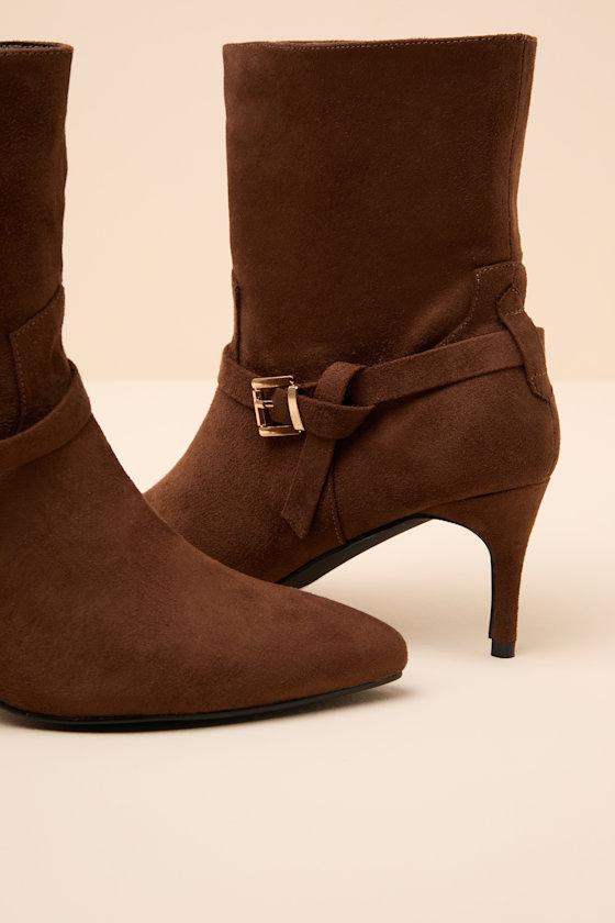 A wear-with-anything look that's effortlessly chic, these sleek little boots lend pep to your step on any day. Crafted from soft faux suede, the ankle-high silhouette features a pointed-toe upper and a knotted accent strap with a shiny gold buckle at the outstep. A classic stiletto heel completes the short 'n' sweet pull-on design.