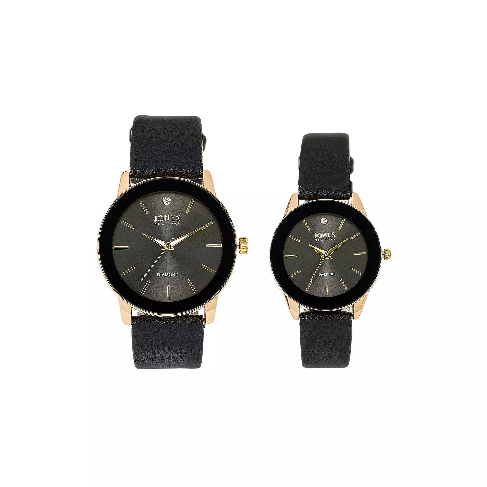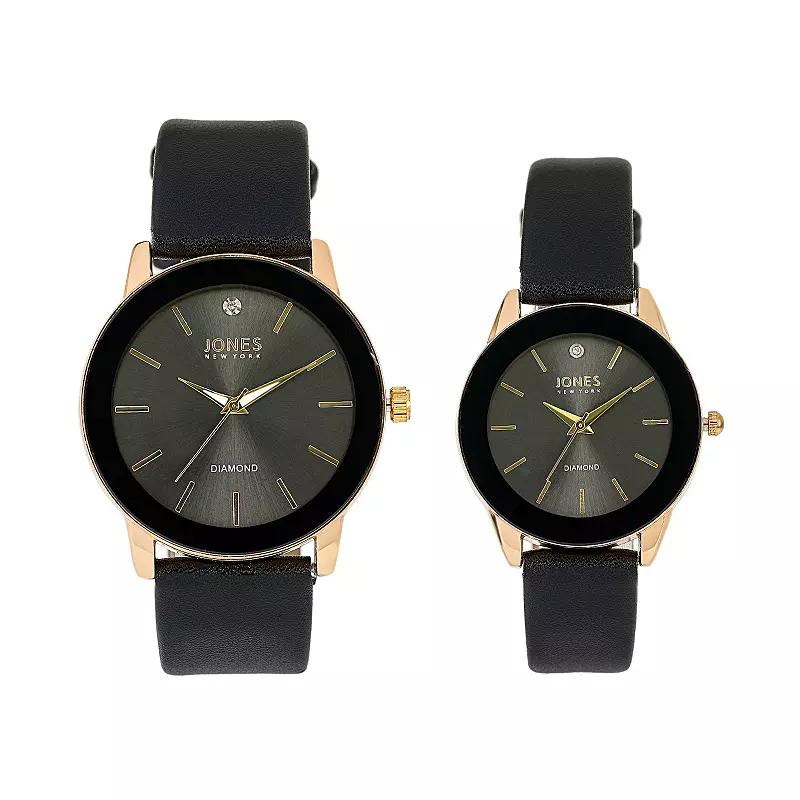 Accent your look with this Jones New York black gold tone his & hers watch set. Click on this JEWELRY & WATCHES GUIDE to learn about fit, styles, materials and more!Accent your look with this Jones New York black gold tone his & hers watch set. Click on this JEWELRY & WATCHES GUIDE to learn about fit, styles, materials and more!FEATURES Stone type: diamondDISPLAY Dial type: sunray Face cover material: glassCASE Material: metal alloy Caseback material: metal alloy Mens case diameter: 42 mm Womens case diameter: 34 mmBAND Band type: strap Material: metal alloy Closure: buckle Mens band length: 247.65 mm Womens band length: 228.6 mmDETAILS Movement: quartz Power: battery Water resistance: splash-proof Packaging: boxed Manufacturers 1-year limited warranty: For warranty information please click here ImportedWHATS INCLUDED Includes one mens and one womens watch Size: 42MM/34MM. Gender: female. Age Group: adult. Material: Leather.