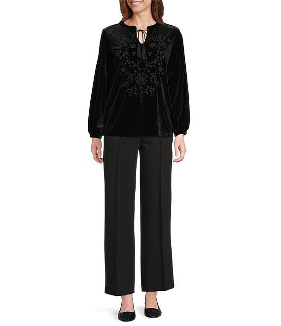 From Jones New York, this blouse features: Stretch velour fabrication V-neck keyhole Long sleeve Floral embroidery Pullover construction Approx. 23.5" length Polyester/elastane Machine wash cold Imported.