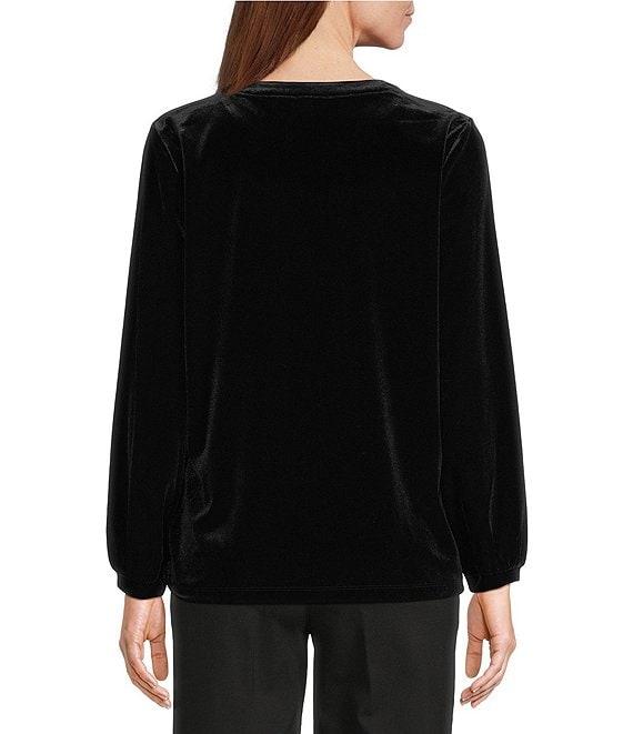 Jones New York Floral Embroidered Stretch Velour Keyhole V-Neck Long Sleeve Blouse