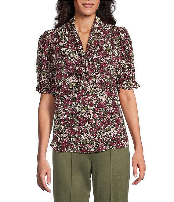 Jones New York Floral Tie Neck Short Puff Sleeve Blouse