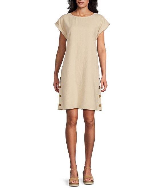 From Jones New York, this dress features: Linen blend fabrication A-line silhouette Crew neckline Short sleeves Both side skirt 4 buttons Lined Pullover construction Approx. 36.875" length Linen/ viscose Machine wash cold/ drip dry or dry clean Imported.