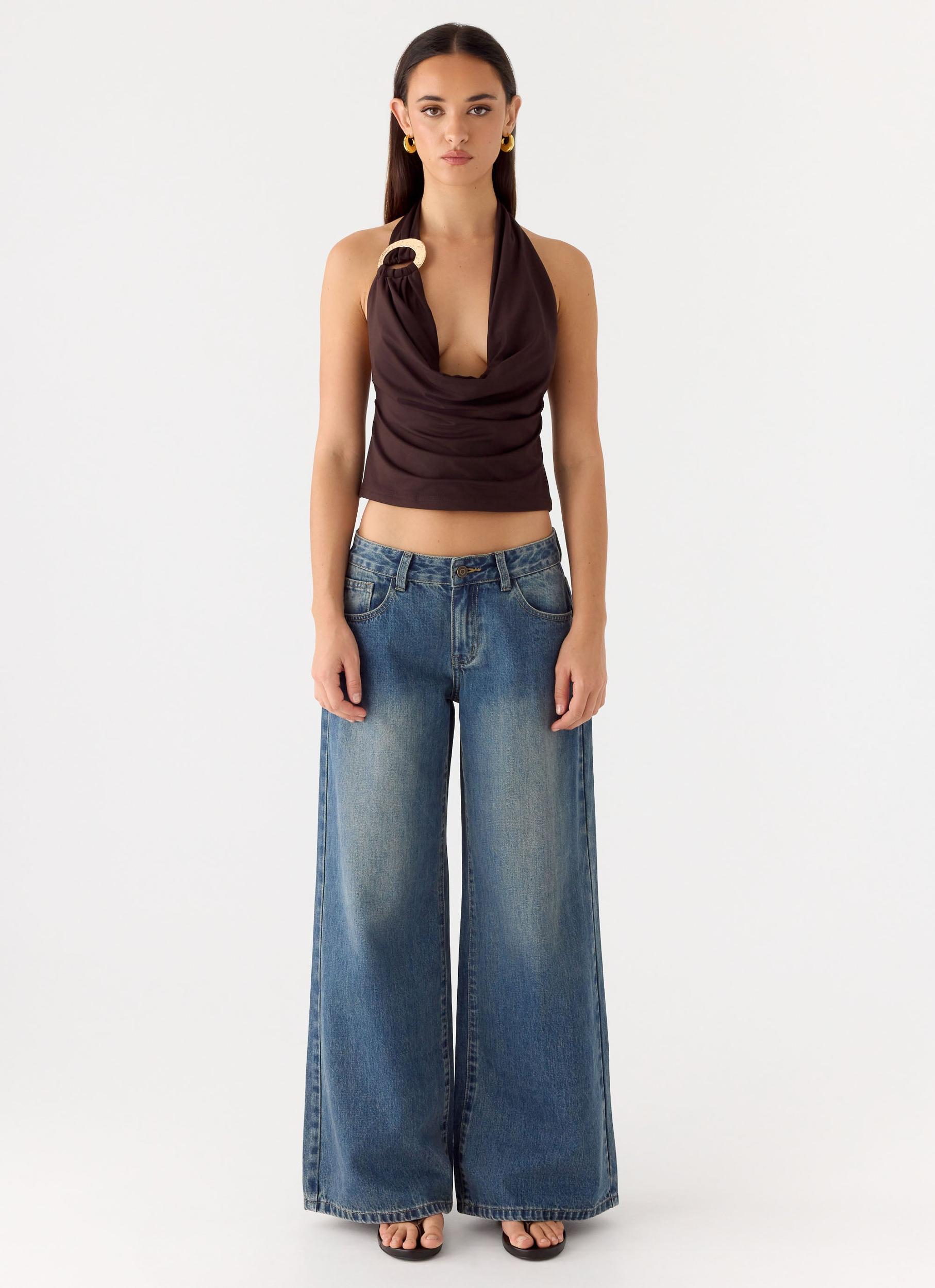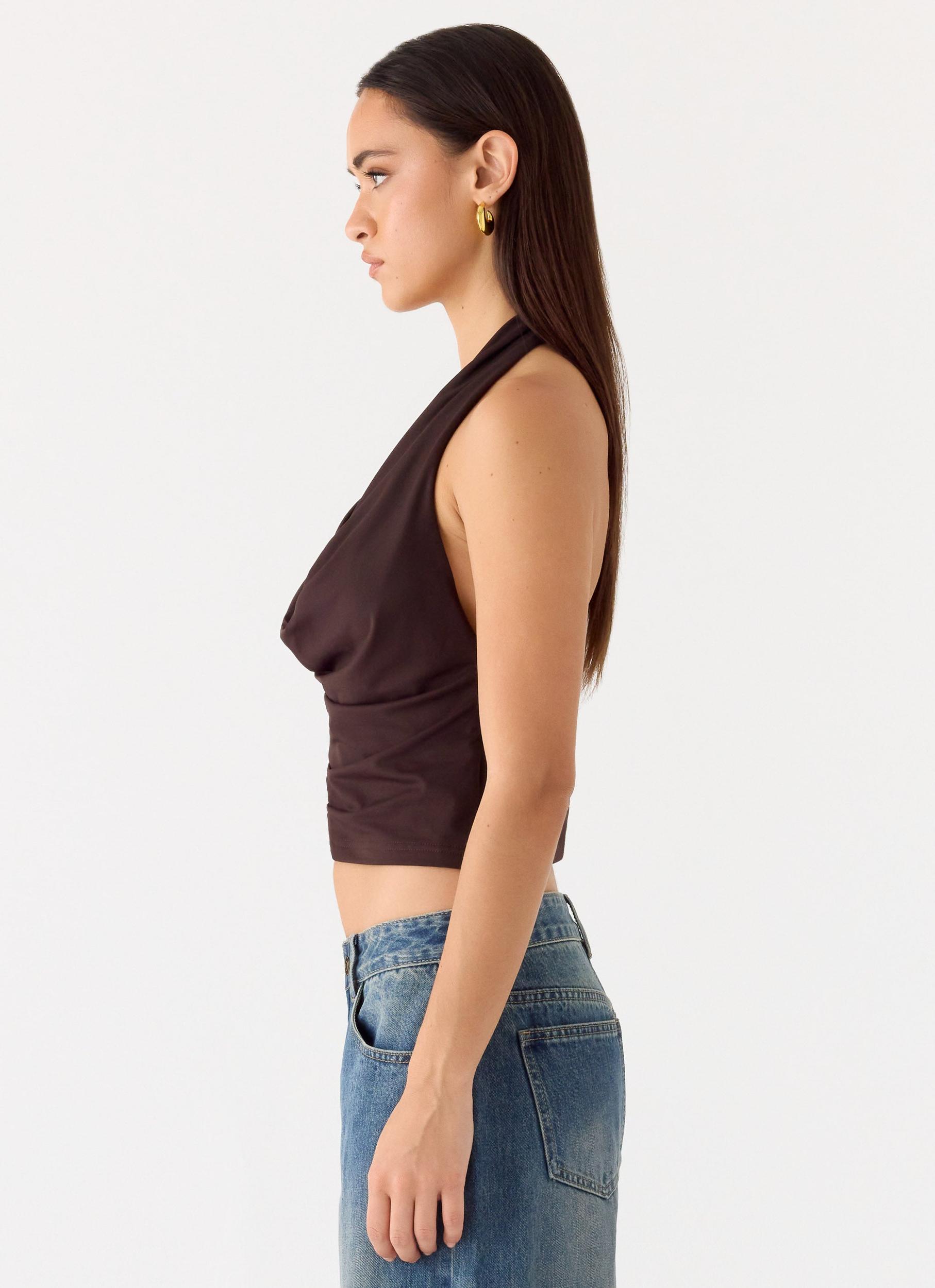 Peppermayo Exclusive The Jonna Top is designed for effortless glamour from sunset to late-night moments. Featuring a low cowl neckline and a low back, it drapes elegantly over the body while a front gold embellishment adds a touch of luxe. Crafted in stretch jersey, it moves with ease for a flattering, comfortable fit. - Low cowl neckline- Low back- Front gold embellishment- Stretch jersey- Fabric: 95% Polyester, 5% Spandex Size AU 8 / US 4 garment measurements:Bust: 28 cm / 11.02 inWaist: 60 cm / 23.62 inHem: 80 cm / 31.50 in Roberta is 177cm and wears size AU 6 / size US 2