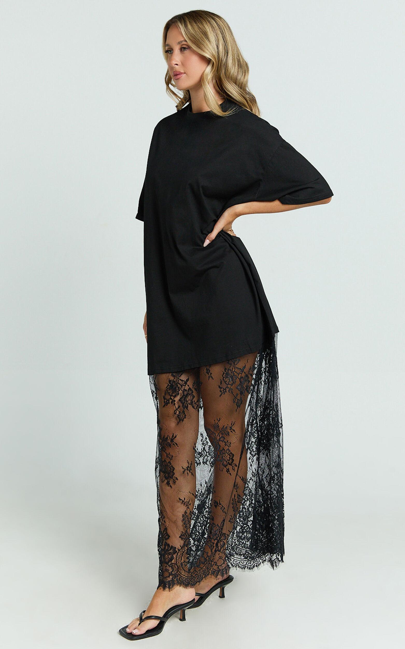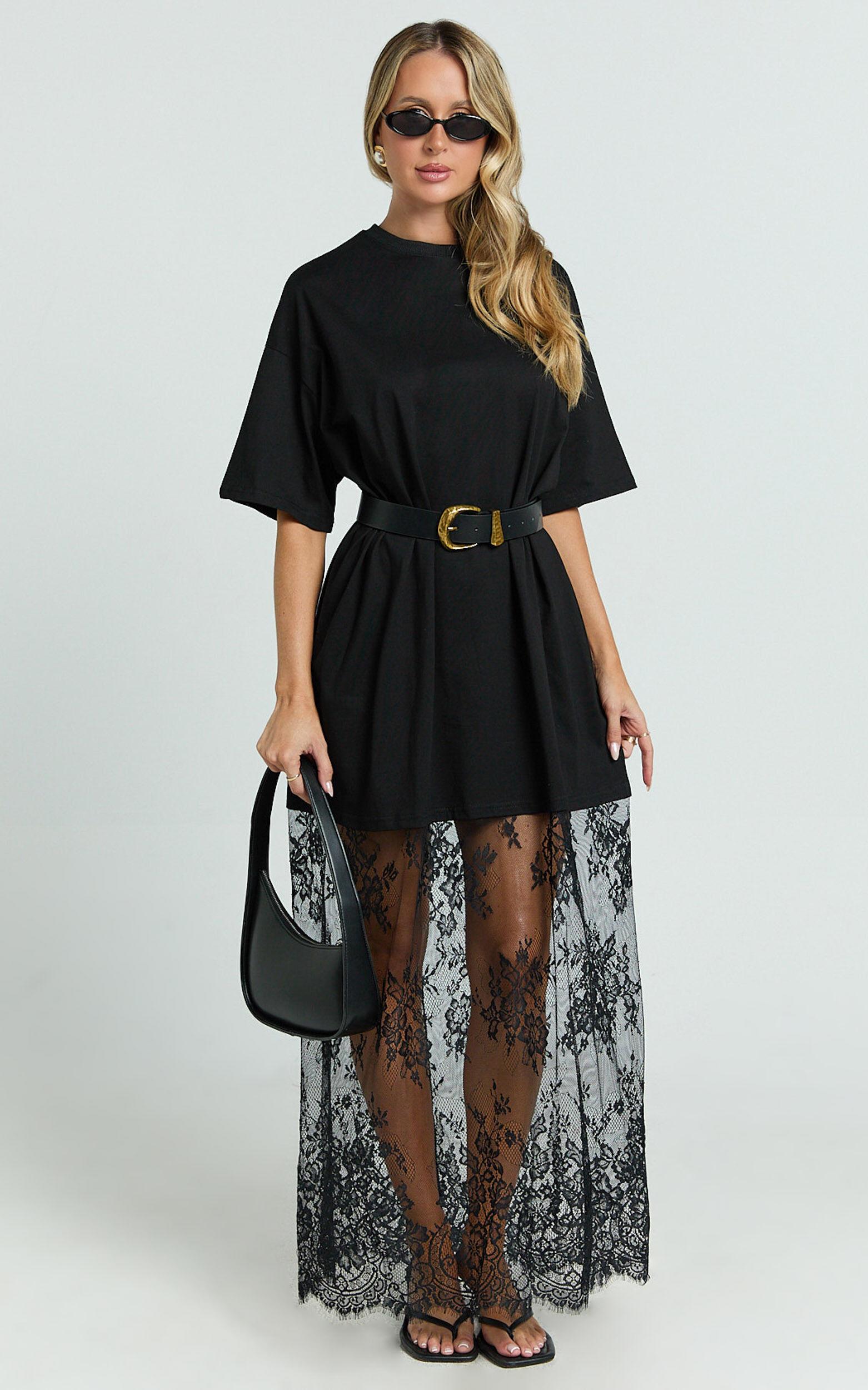 Crafted in timeless black, this longline tee features delicate lace accents that add a playful, romantic twist to your everyday look. Whether you're pairing it casually with baggy jeans and white sneakers for weekend outings, or styling it over trendy TikTok leggings as part of your fitness ensemble, this versatile top guarantees endless style possibilities.Thanks to its relaxed yet flattering fit and easy-to-layer length, the Jonna Top transitions seamlessly from casual days to nights out. Tuck it into a bold miniskirt for evening plans or wear it loosely over denim shorts for brunch dates. Stylish, comfortable, and effortlessly cool, it's the kind of top you'll find yourself reaching for again and again!Product Details:Cotton fabricBoat necklineLongline designShort sleevesMaterial and Care100% CottonLow / No stretch