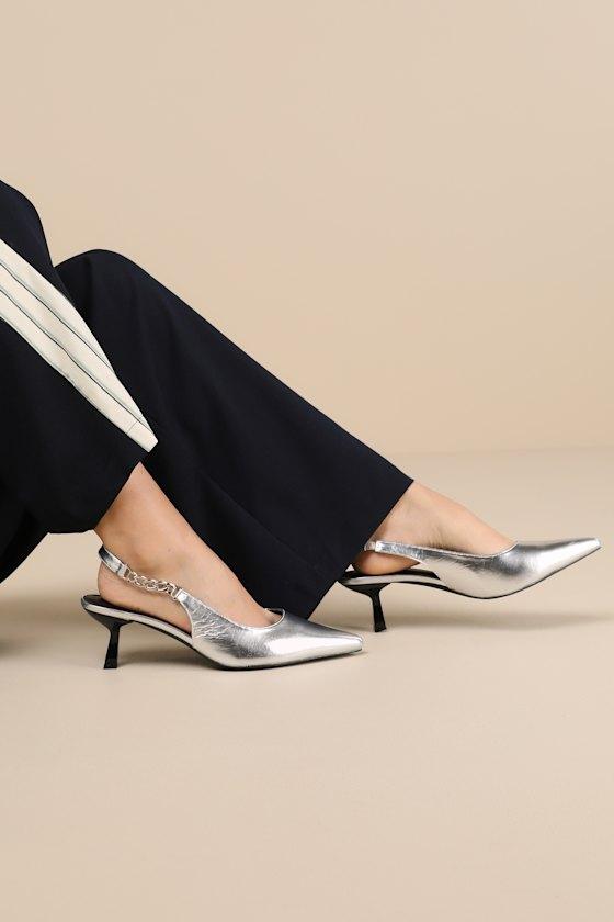Easily add a sophisticated finish to any of your favorite looks with the Lulus Jonnah Silver Chain Slingback Strap Pointed-Toe Pumps! Shiny metallic faux leather shapes these must-have heels that feature a classy pointed-toe upper that carries into a trendy slingback strap with a chunky, silver chain detail at the outstep (and a bit of elastic at the instep for fit). An eye-catching sculpted heel completes the ultra-chic design.
