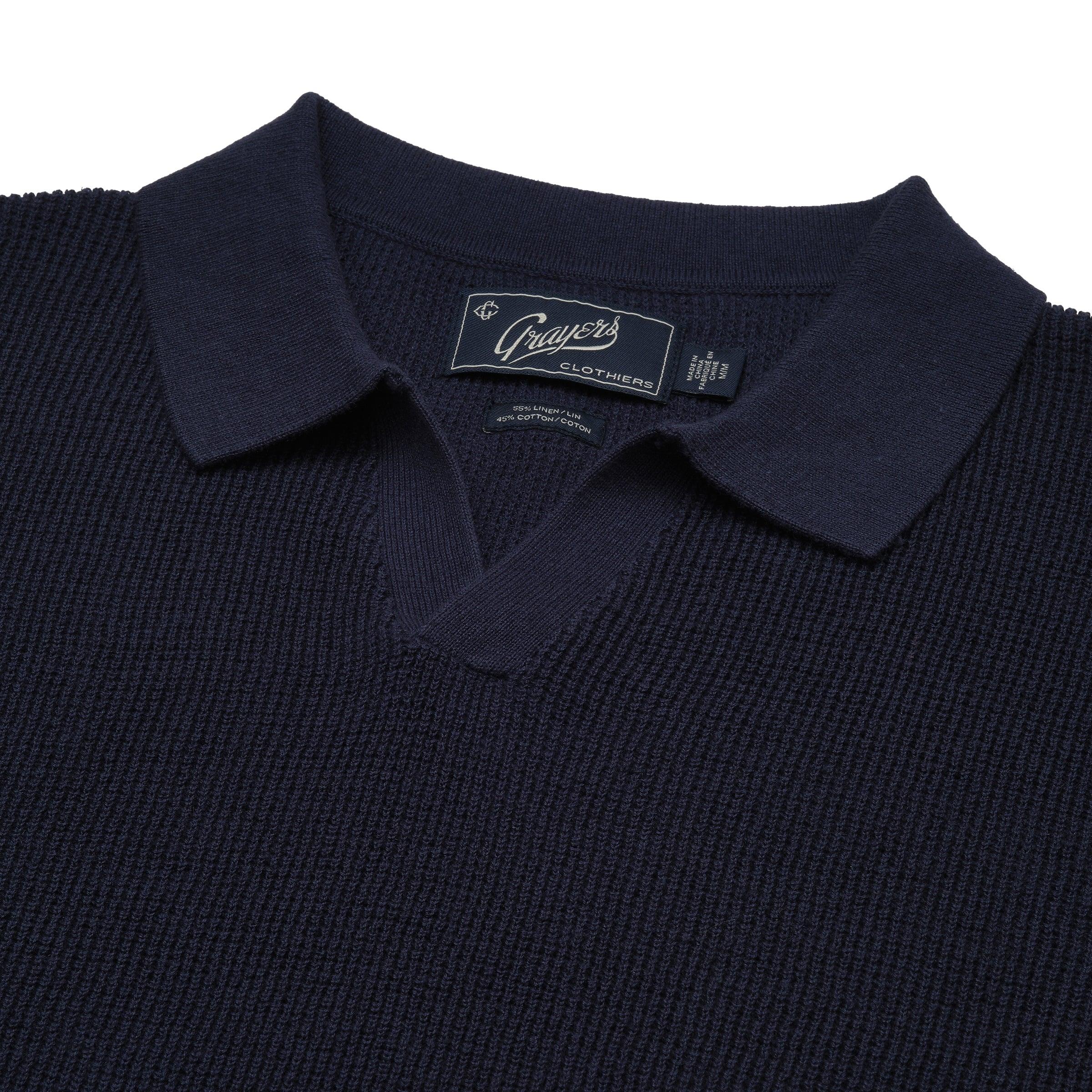 The Jono is what happens when your laziest instincts meet your sharpest style. Knit from fine cotton and linen yarn in a breathable tuck stitch (aka fancy texture), it’s lightweight, laid-back, and just polished enough to fool people into thinking you had a plan. The Johnny collar gives it a whiff of Riviera rogue, while the ribbed cuffs and hem say, I read the dress code… loosely. It’s not quite a knit polo shirt, not quite a sweater. It’s the sweet spot between "just rolled out of bed" and "sure, I’ll take the wine list." Goes with: cocktails, chaos, and whatever Grayers bottoms are clean. The Model is also wearing: Model: ----Details---- 12-gauge cotton and linen knit that breathes better than you do Textured tuck stitch, because smooth is overrated Ribbed trim and Johnny collar, all vibes, no buttons Clean hem for untucked living Fully fashioned (so you don’t have to be) Imported ----Materials---- 55% Linen 45% Cotton ----Size & Fit---- Measuring Method: All measurements are in inches and based on a flat garment, as shown below. For comparison with one of your existing garments, please lay garment on a flat surface and follow the key measurement points. For chest and neck, if you double the flat measurement, you will get close to the full body measurement. ----Care---- Hand wash cold with similar colors Do not soak before washing Do not bleach Remove promptly after wash Lay flat to dry Do not tumble dry Cool iron on reverse side if necessary Or Dry Clean