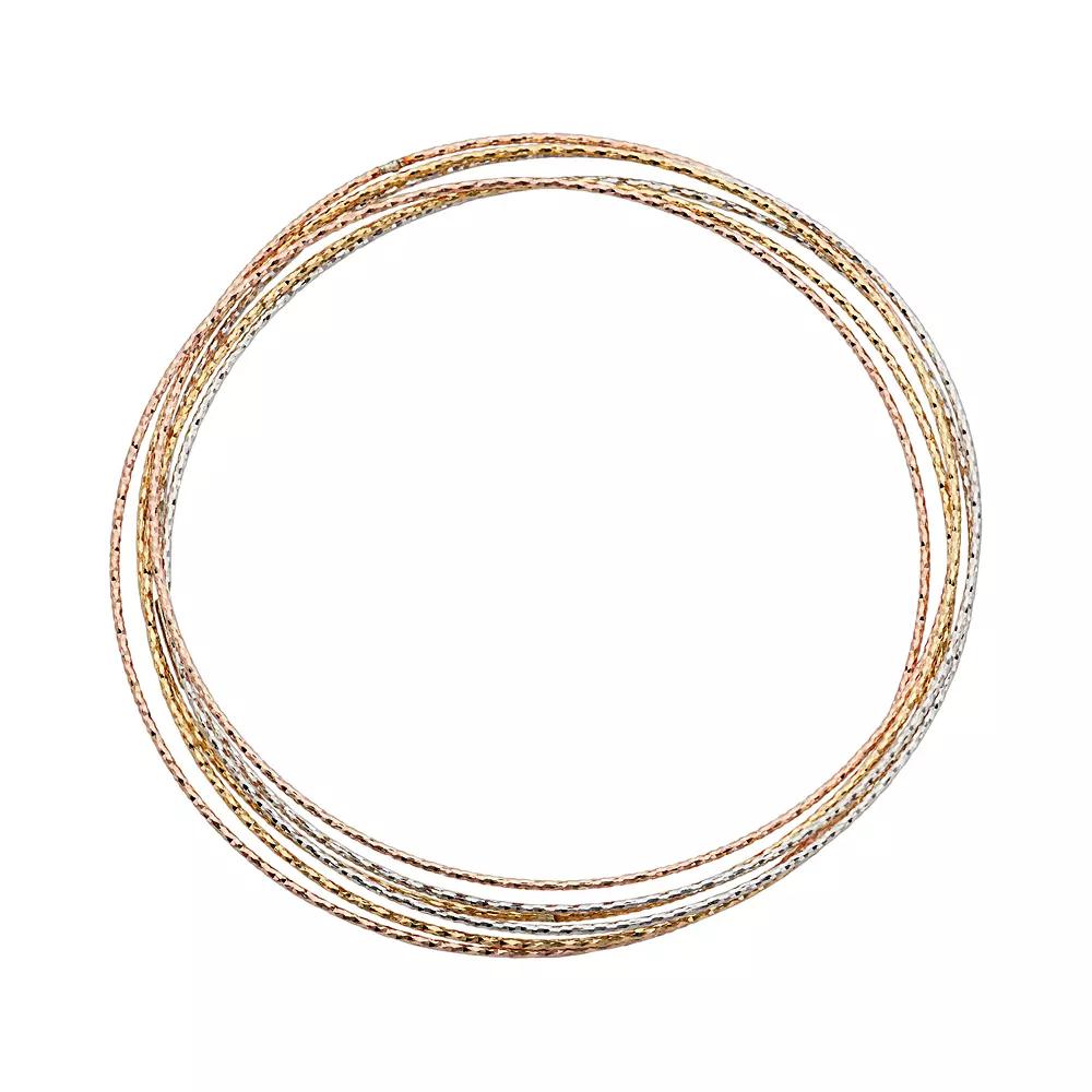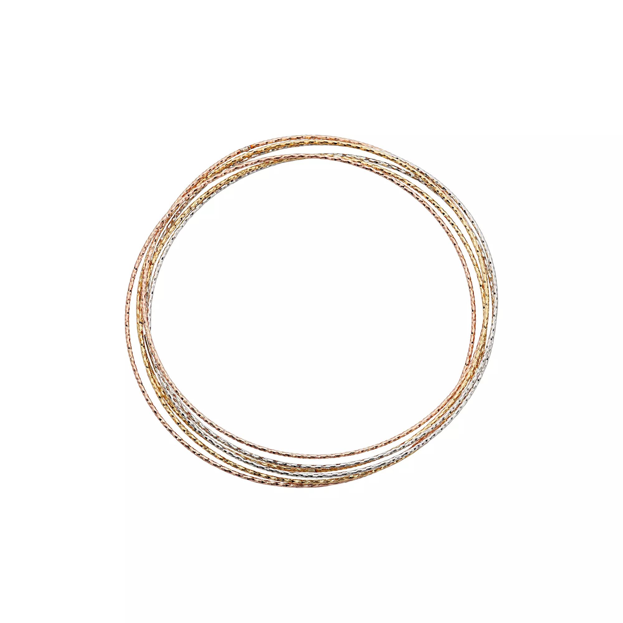 Add sparkling style to your ensemble with this tri-tone interlocking bangle bracelet.Bracelet Details: Length: 8.25 in. Metal: 14k gold over sterling silver, 14k rose gold over sterling silver, rhodium-plated sterling silver Features: diamond-cut details Size: 8". Color: Multicolor. Gender: female. Age Group: adult. Material: Sterling Silver Rhodium Gold Plate.