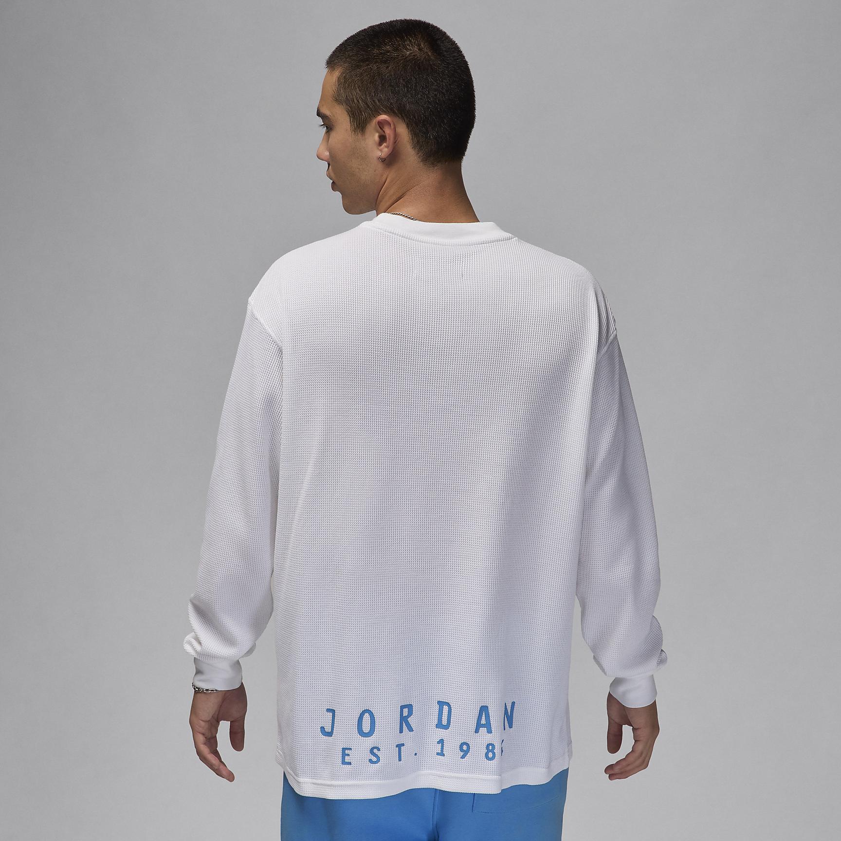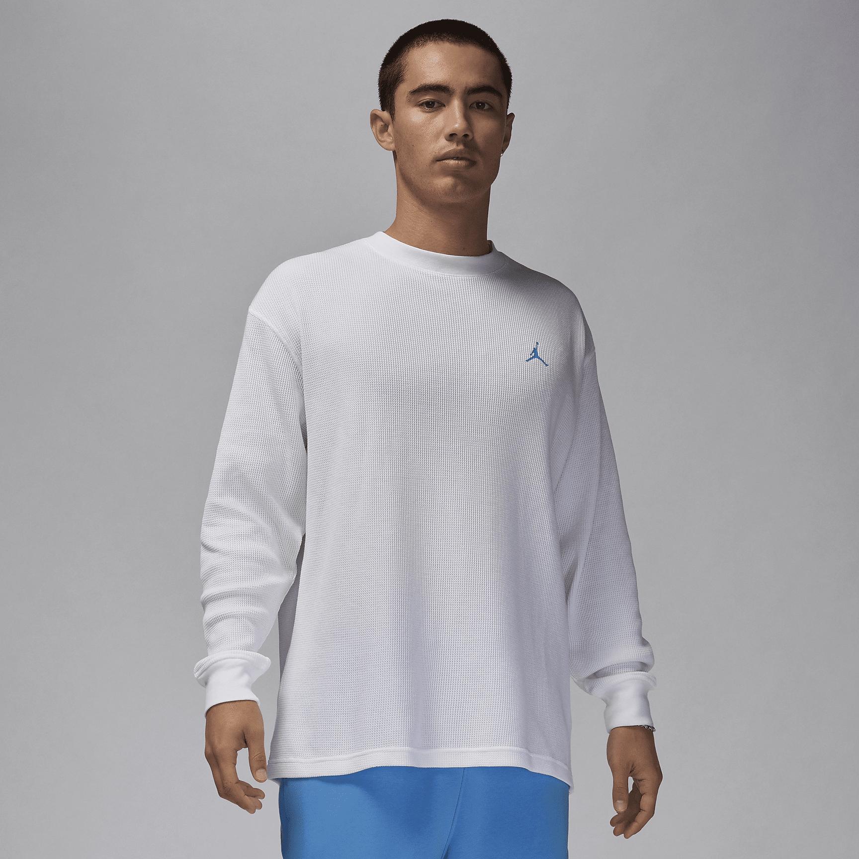 Get cold-weather ready with this roomy long-sleeve top. Its thick waffle knit fabric helps you stay warm and cozy when temperatures dip. [] Product Details:59% cotton/41% polyester. Ribbed cuffs. Machine wash. Imported. Style: FV7456; Color: White/Legend Blue; Size: XS; Gender: Male; Age Group: Adult | Jordan Essentials Men's Long-Sleeve Top in White, Size: XS | FV7456-100