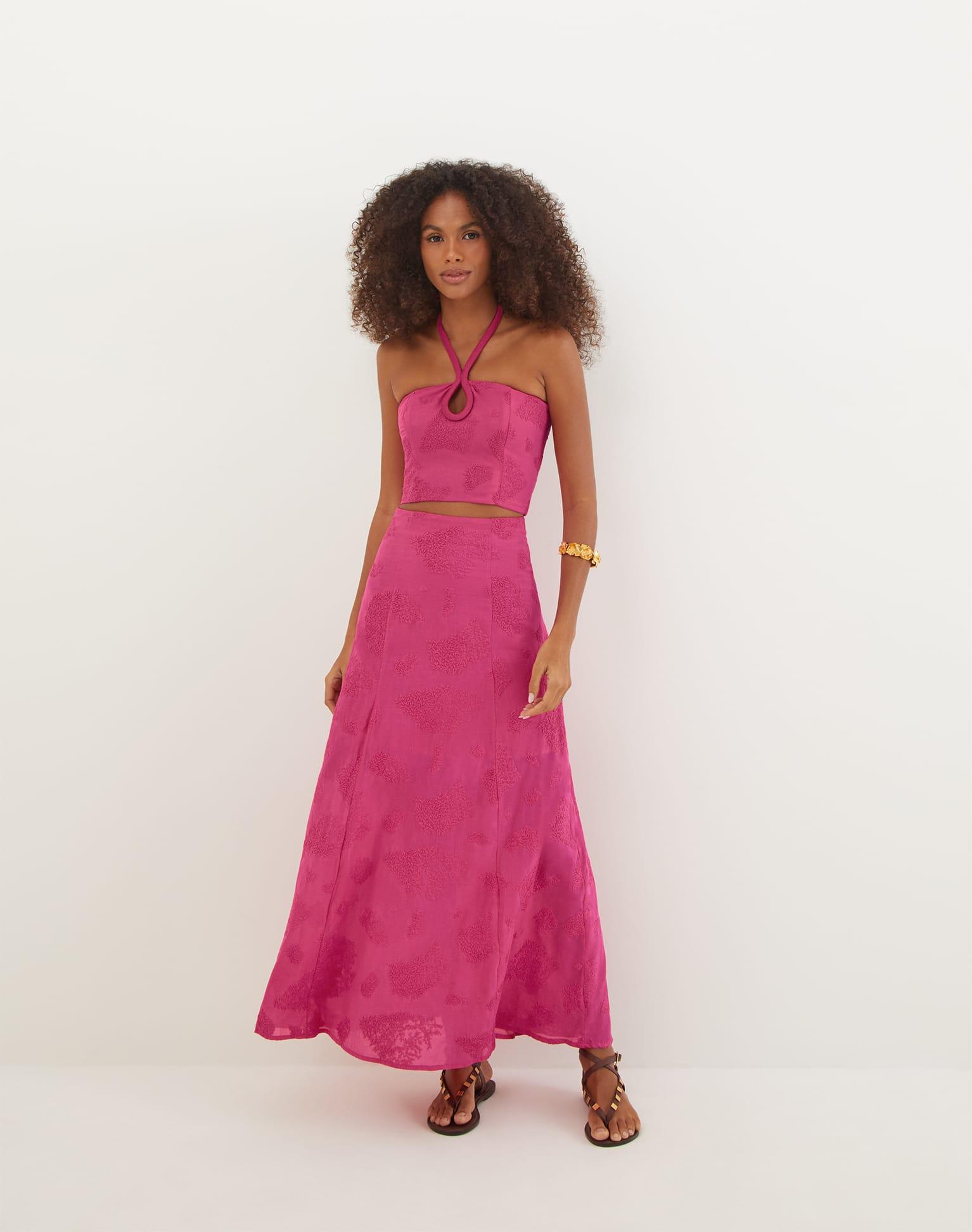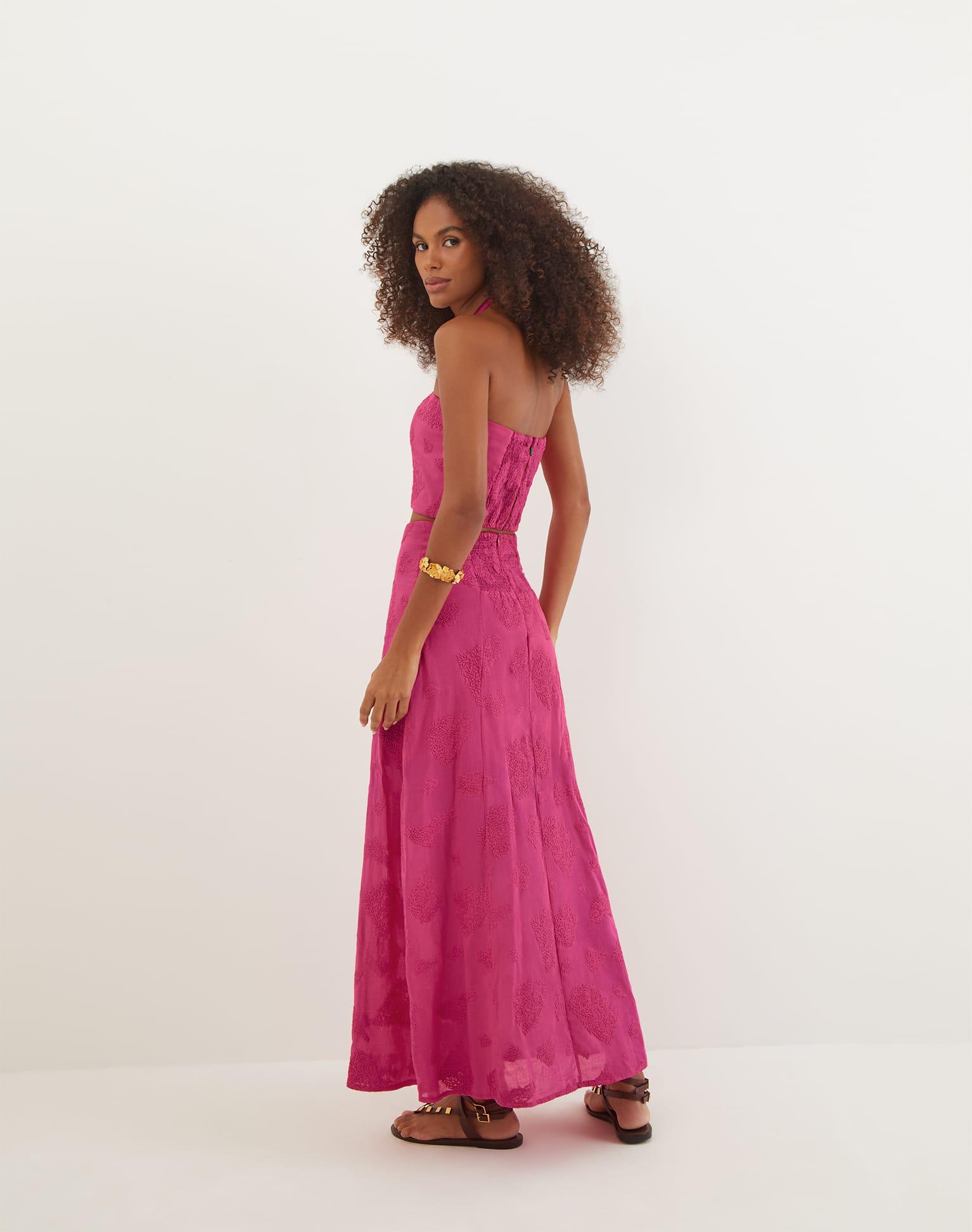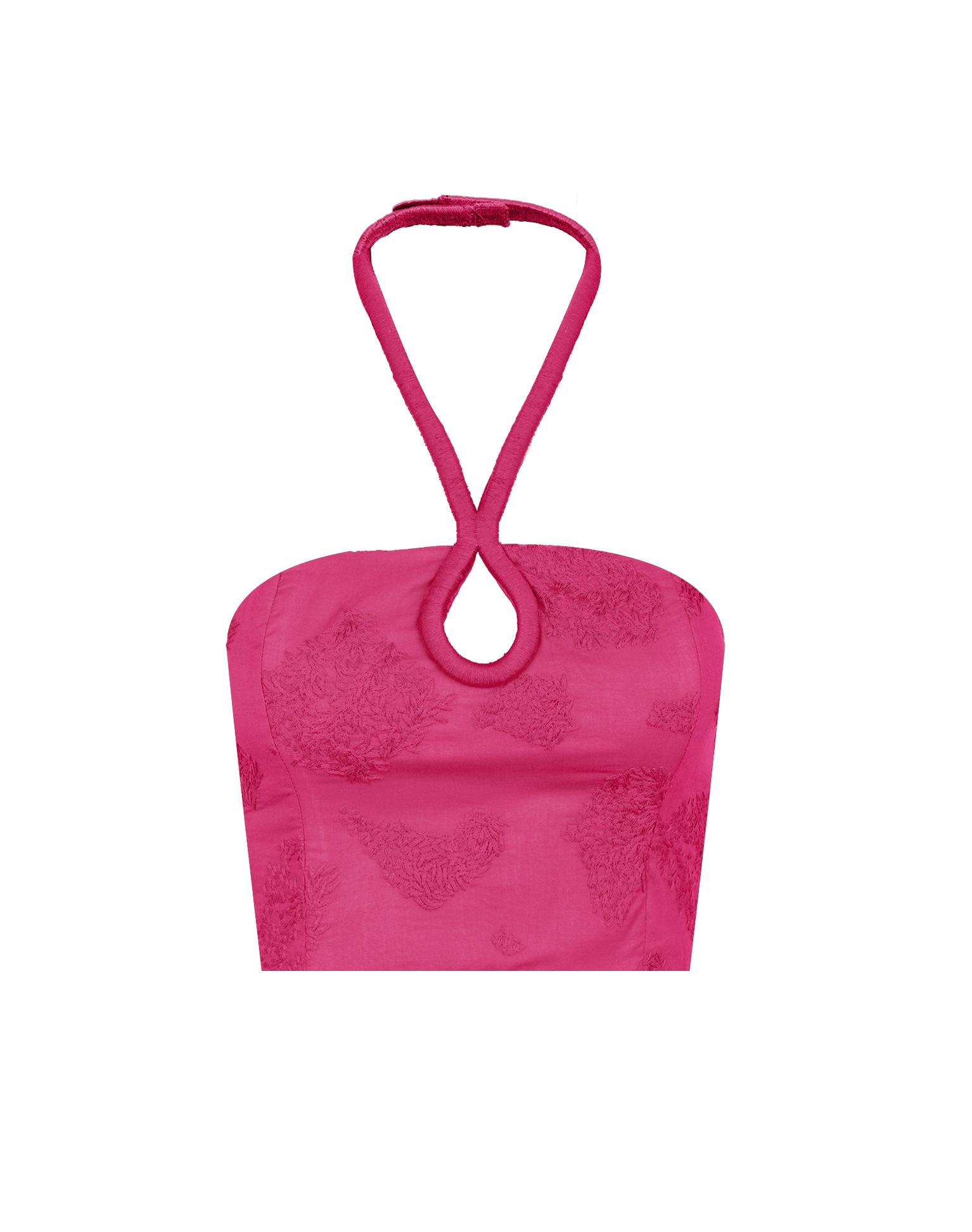 The ViX Jordana Blouse is a sleeveless cropped top with a chic halter neck design with a smocked back and features intricate embroidered motifs throughout. Pair the Jordana Blouse with a matching bottom for an elevated look or pair with denim and sandals for a more casual summer ensemble. Features: Sleeveless Structured halter neck design Keyhole detail at bust Button closure at back Fully lined Style# VR252044
