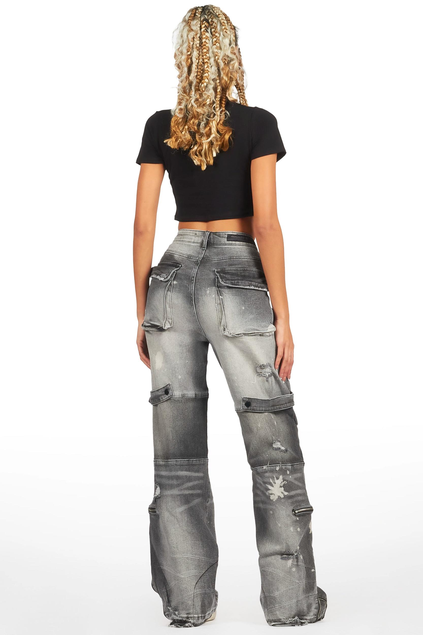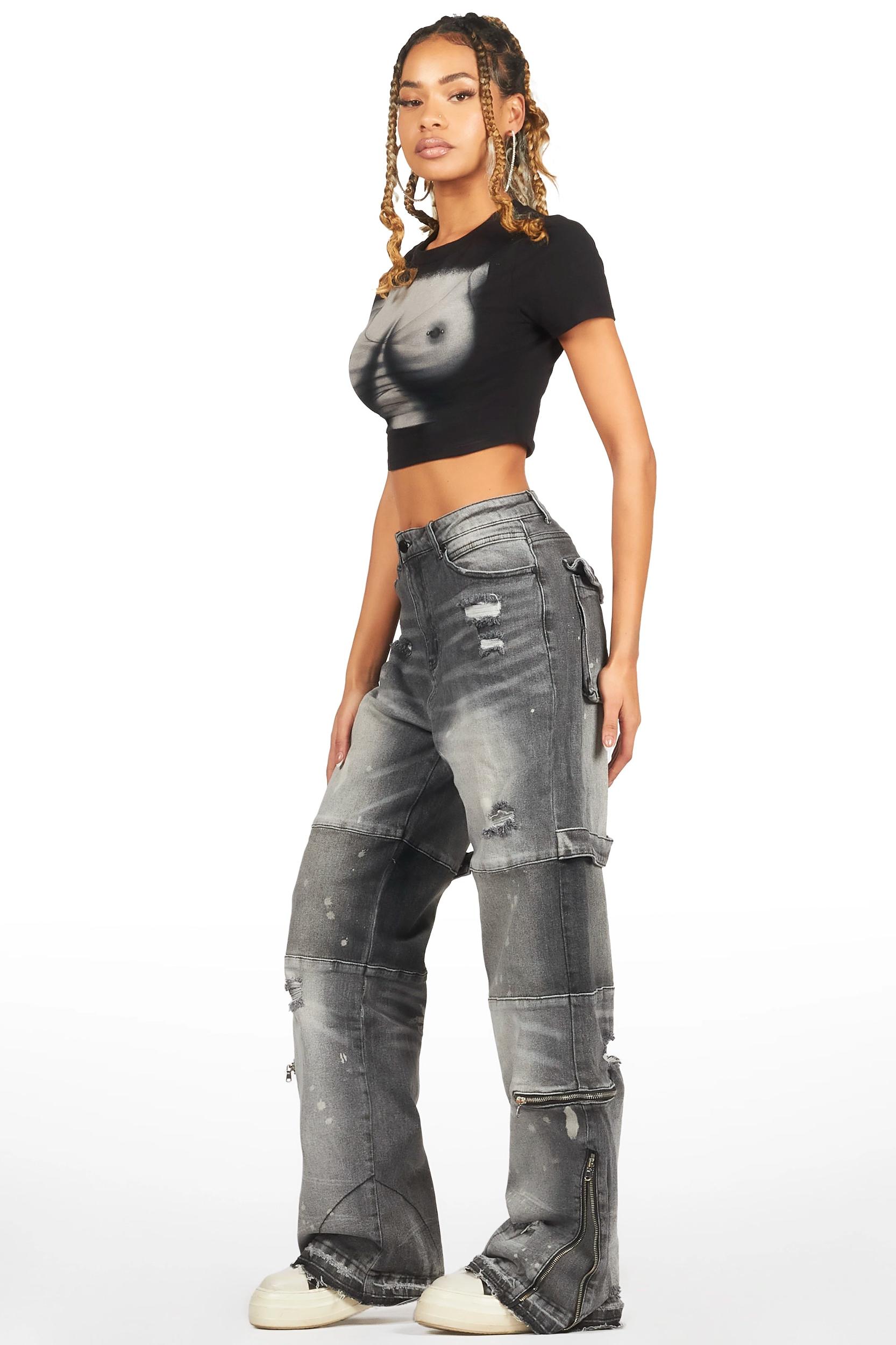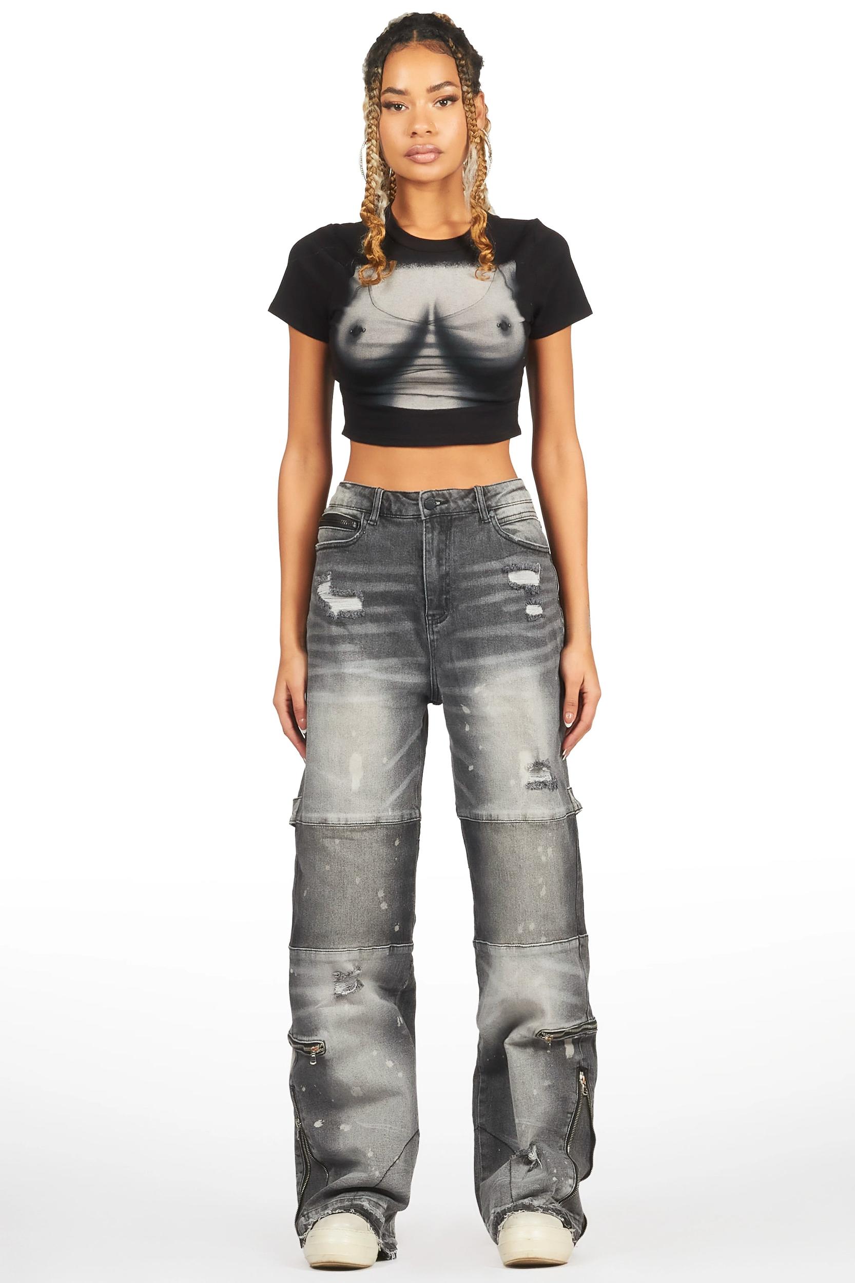 An urban wide-leg cargo jean for women in grey wash. Designed with organic cotton and a baggy silhouette for a must-have streetwear style. Zip fly with button closure 7-pocket build Custom moto biker designing Distressed detailing Bleach wash Zipper hems Wide-leg fit Baggy denim construction